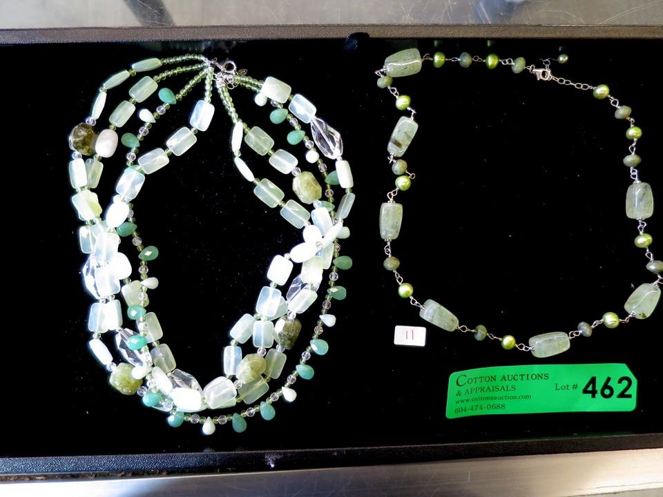 1st Necklace is Green Jade, Brazilian Crystal Quartz, Green Aventurine Necklace 639 Carats. 2nd Necklace is Green Jade, Freshwater Pearl 10.75 Carats.