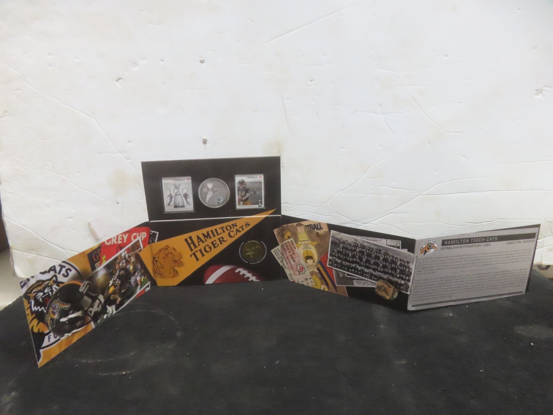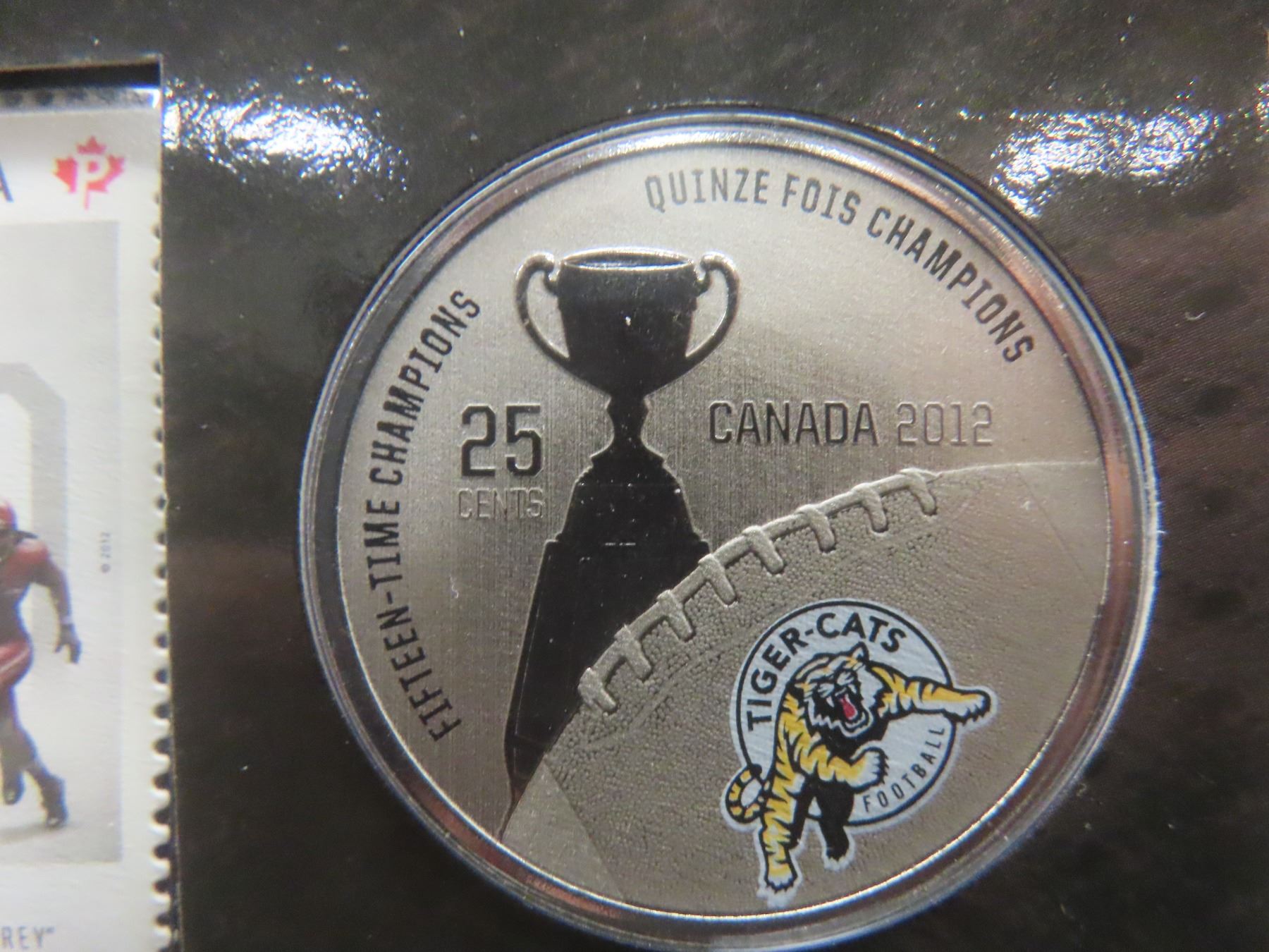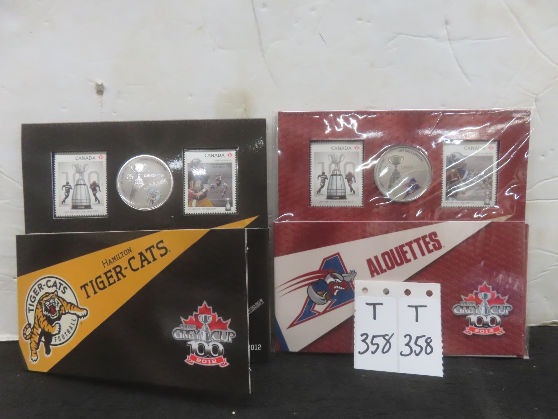 Two 2012 Canadian Grey Cup Coin And Stamp Sets: Hamilton Tiger-Cats And Montreal Alouettes
