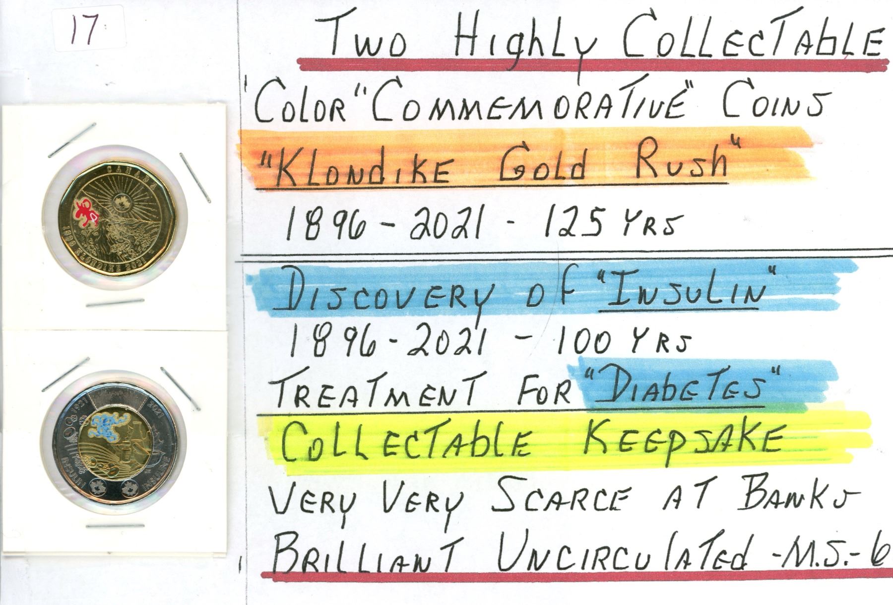 Two 2021 Colour Commemorative Coins - Klondike Gold Rush Loonie, Insulin Discovery Anniversary Toonie