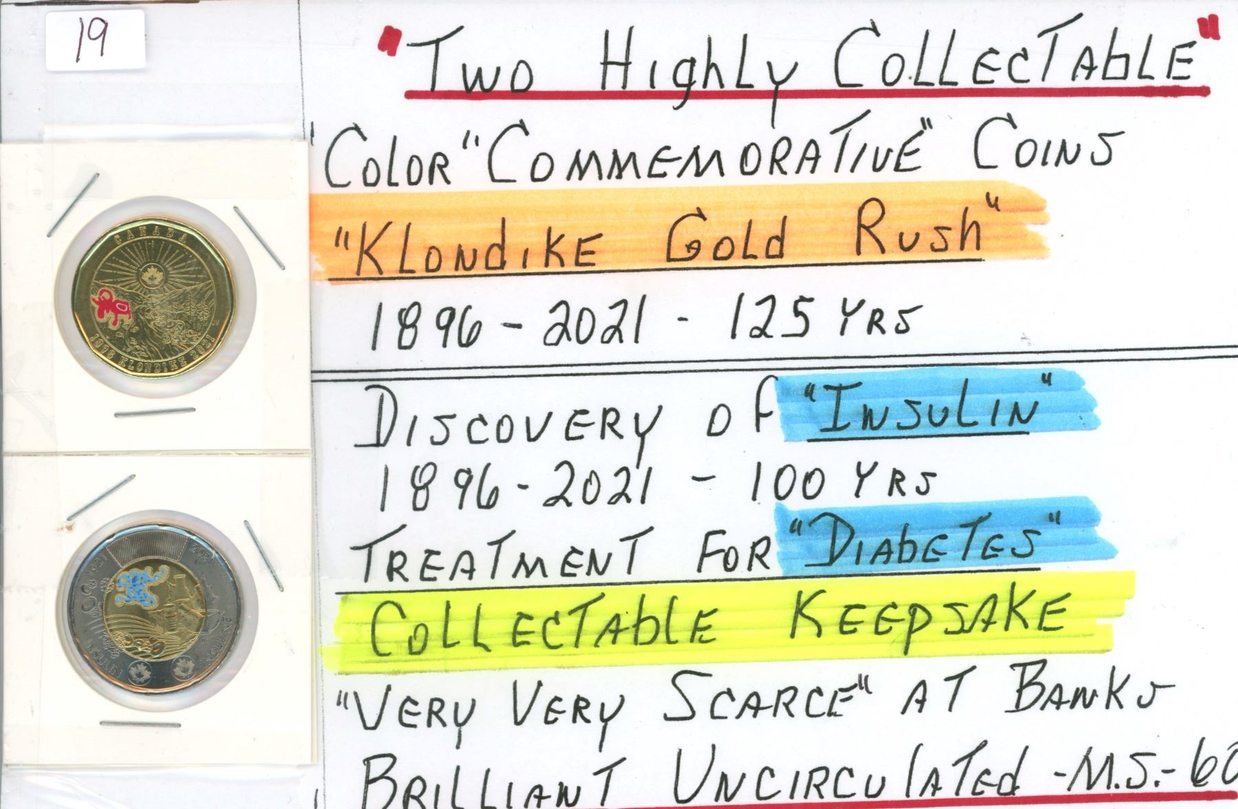 Two 2021 Colour Commemorative Coins - Klondike Gold Rush Loonie, Insulin Discovery Anniversary Toonie