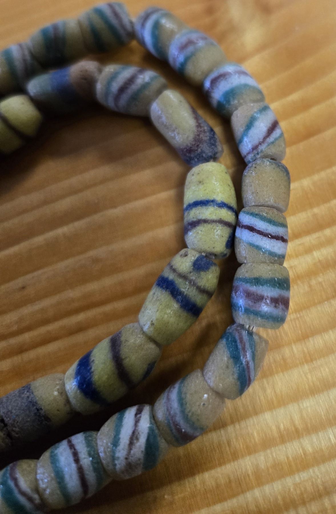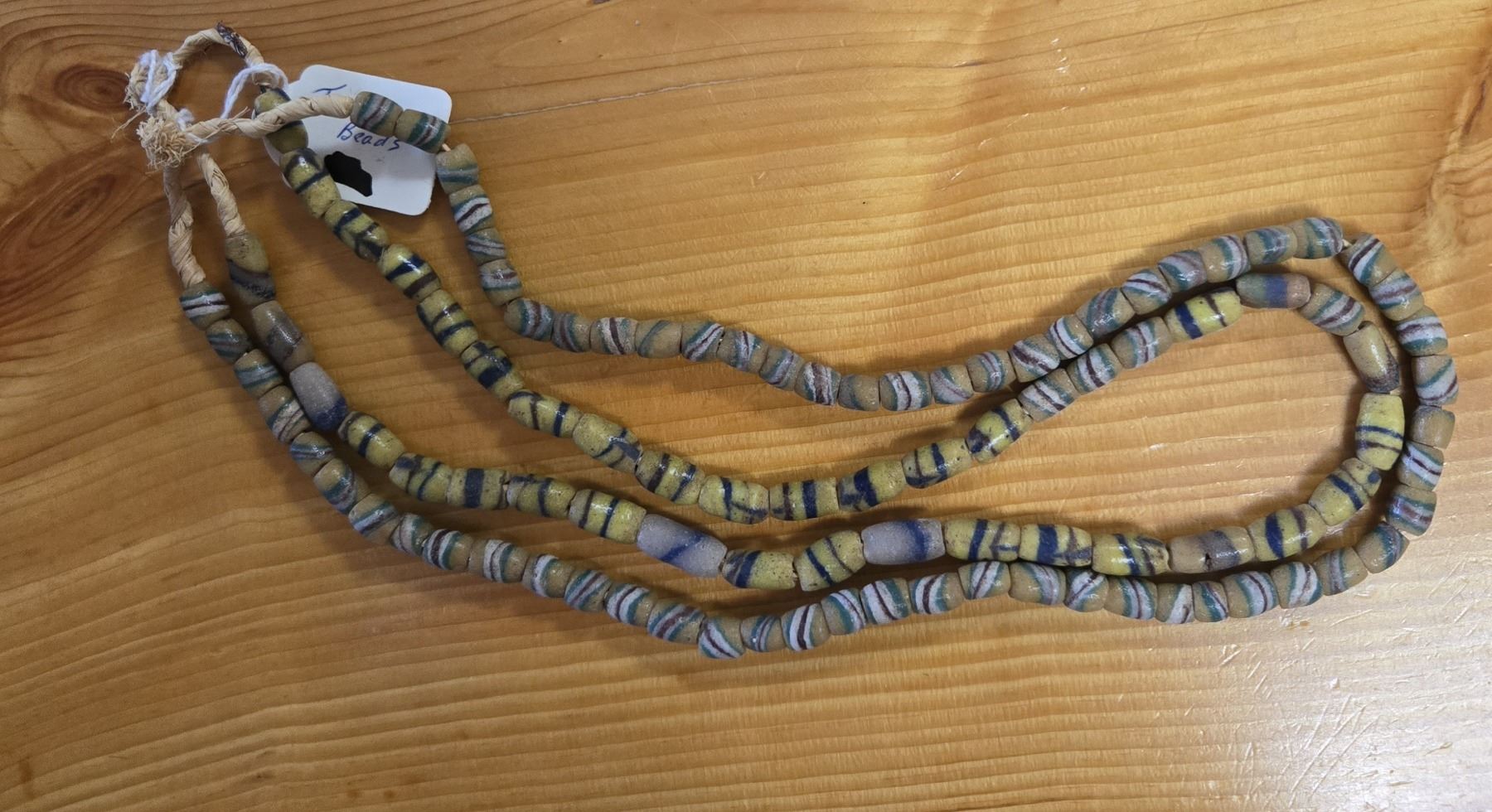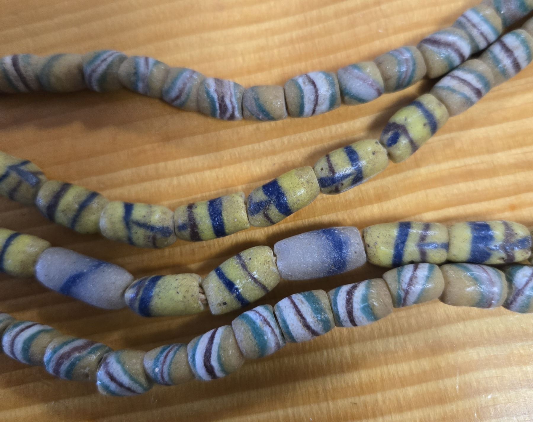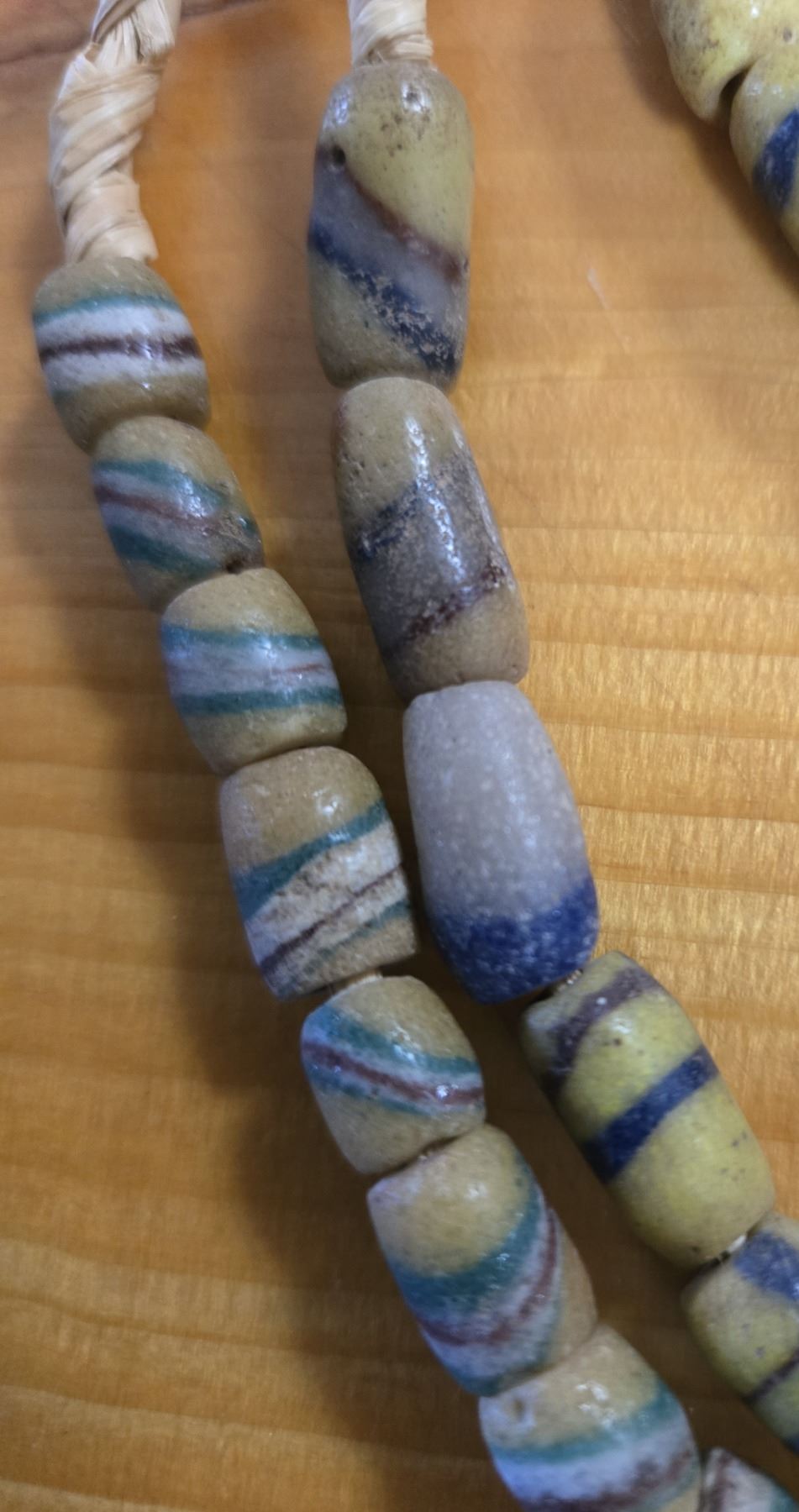 Two 24” Antique Venetian Yellow Sand Cast Trade Beads. Each bead measures approximately 8 mm in diameter
