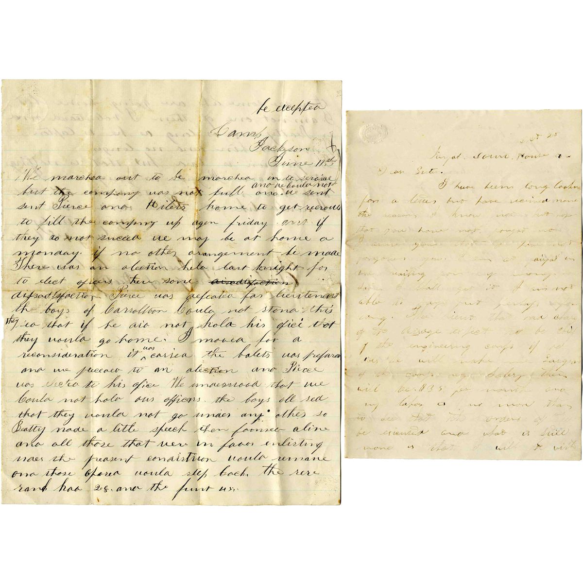 Two letters from George H. Ebersole of the 32nd Ohio Infantry, Company F, to his sister. Datelined ''Camp Jackson / June 11th [1862],'' first letter reads in part: ''…There was an election held last knight…Pierce was defeated for lieutenant the boys of Carrolton County could not stand this they sea that if he did not hold his ofice that they would go home. I moved for a reconsideration…the boys all sed that they would not go under any other so Beatty made a little speech then formed a line and all those that were in favor enlisting near the present condition would remane and those oposed would step back. the rere rank had 28 and the front 45…'' Second letter, datelined ''Fairfax Court House Oct 25 [1862],'' reads in part: ''…I am at Fairfax in Va waiting for my money…The lieut that had charge of the brigade expect to be chief of the engineering corps if he does he will make me sergeant of the corps. my salery then will be $35 per month and my labor is no more than to see that the orders of Lieut be exicuted and what is still more is that I will be with the headquarters of gen sigle I suppose that you had a nis time at the fare. I thought that I would get home for it but could not get my money in time…'' George Ebersole mustered into Company F on 30 August 1861 and drowned off the steamer Horizon on 1 May 1863, during the regiment's move toward Vicksburg. During his service, the 32nd Ohio fought at the battles of McDowell, Harper's Ferry, Cross Keys and Port Republic. Ink letters measure 5.25'' x 7.75'' and 7.5'' x 9.5'' and total 3.5pp. Paper shows mild toning and occasional light soiling. Fading to ink of one letter. Overall, excellent condition.