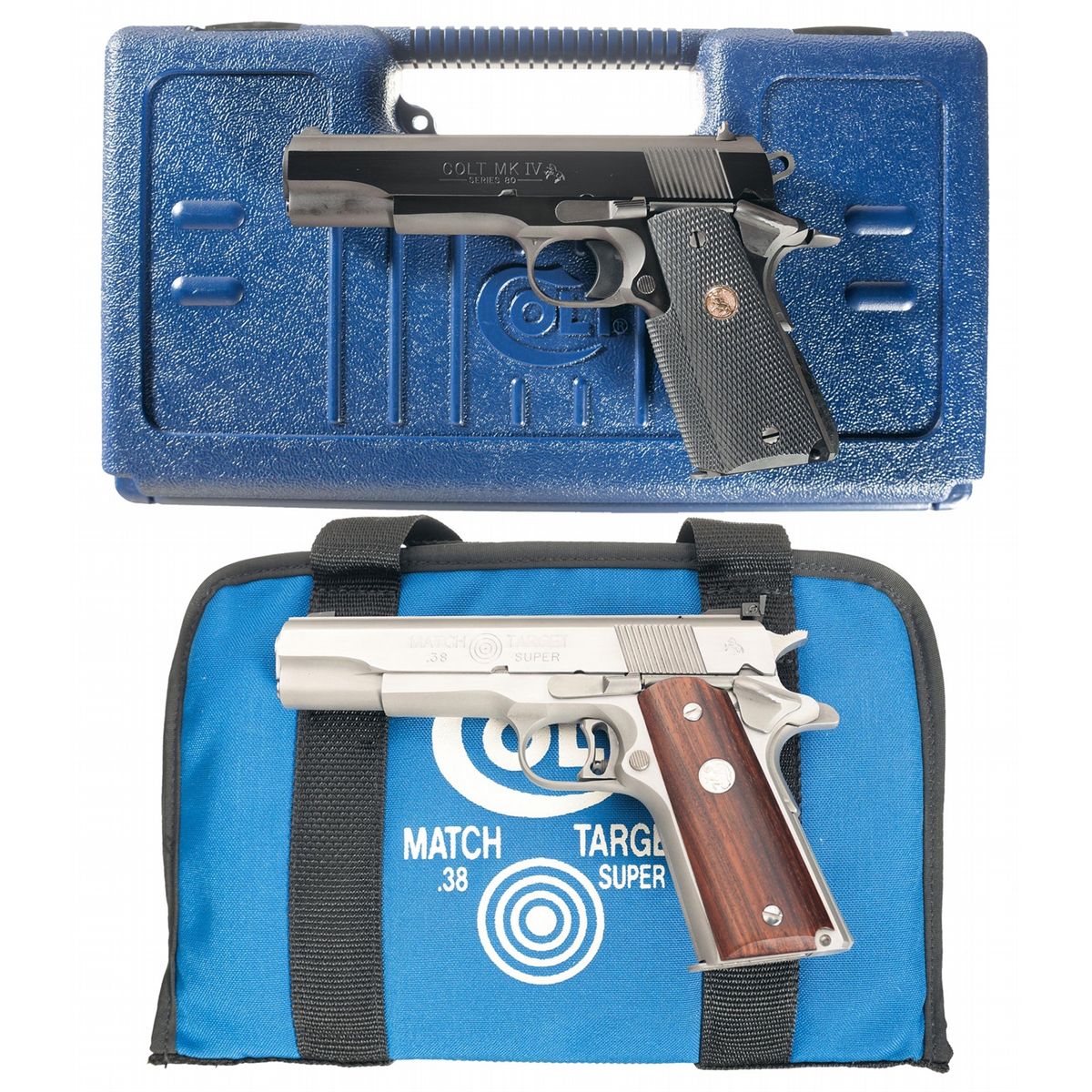 A) Colt model 01923E with blue plastic Colt hardcase numbered to gun, 1 extra 9x23 magazine and a .38 Super conversion barrel and magazine.