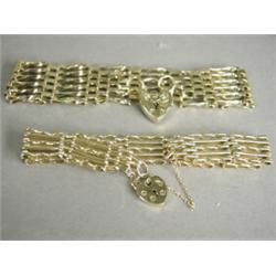 Two 9ct gold gatelink bracelets: one six bar twist, the other five bar, both with heart lockets and safety chains Est. 150/200