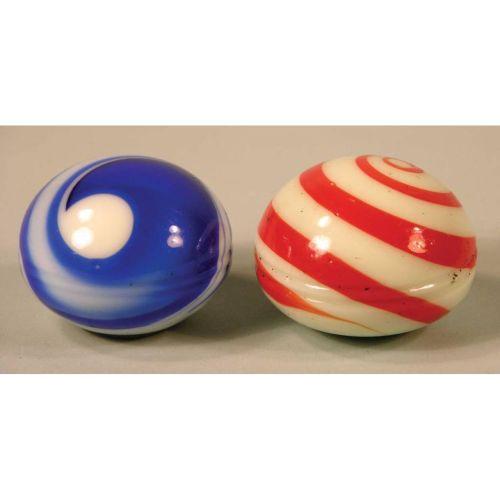 Two Acro Agate Gear Shift Knobs, blue and white and red and white swirl. Excellent condition, with threads. 2 inch diameter.