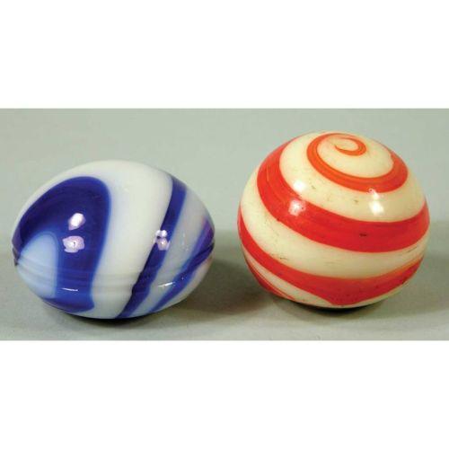 Two Acro Agate Gear Shift Knobs, blue and white and red and white swirl. Excellent condition, with threads. 2 inch diameter.