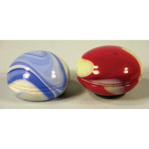 Two Acro Agate Gear Shift Knobs, red and white and blue and white swirl. Excellent condition, with threads. 2 inch diameter.