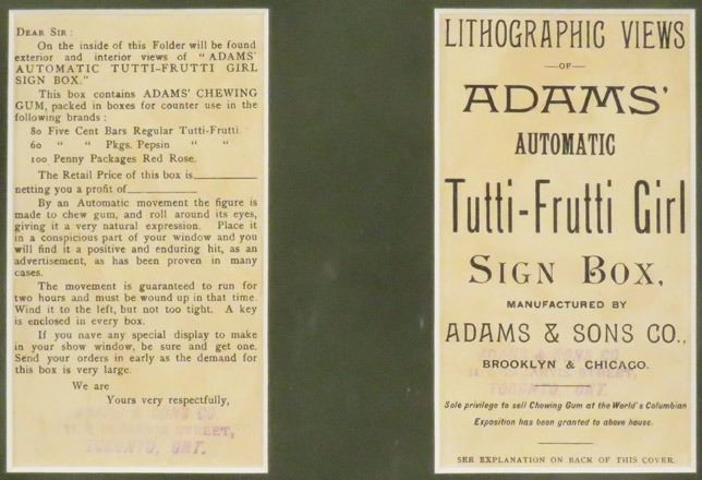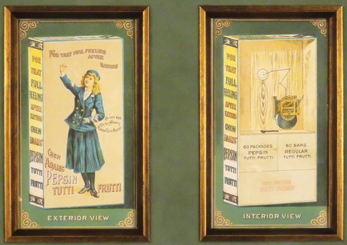 Two Adams Pepsin Tutti Frutti Trade Cards. Depicting display dispensing box. Framed under glass to display both sides. Near mint condition.