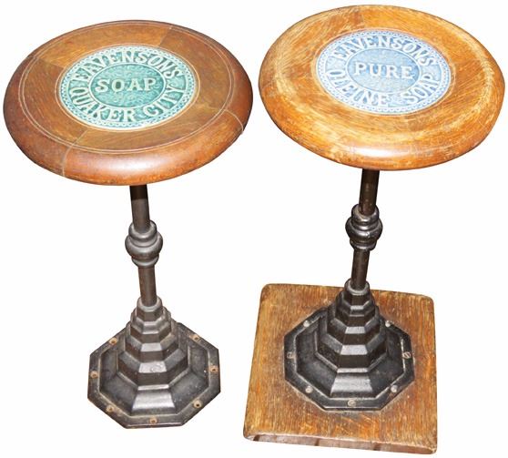 Two Advertising Soda Fountain Bar Stools. Porcelain tile inserts advertising Evenson's Quaker City Soap and Evenson's Pure Oleine Soap. Cast iron base, wood frame. Good original condition. 22 inches tall.