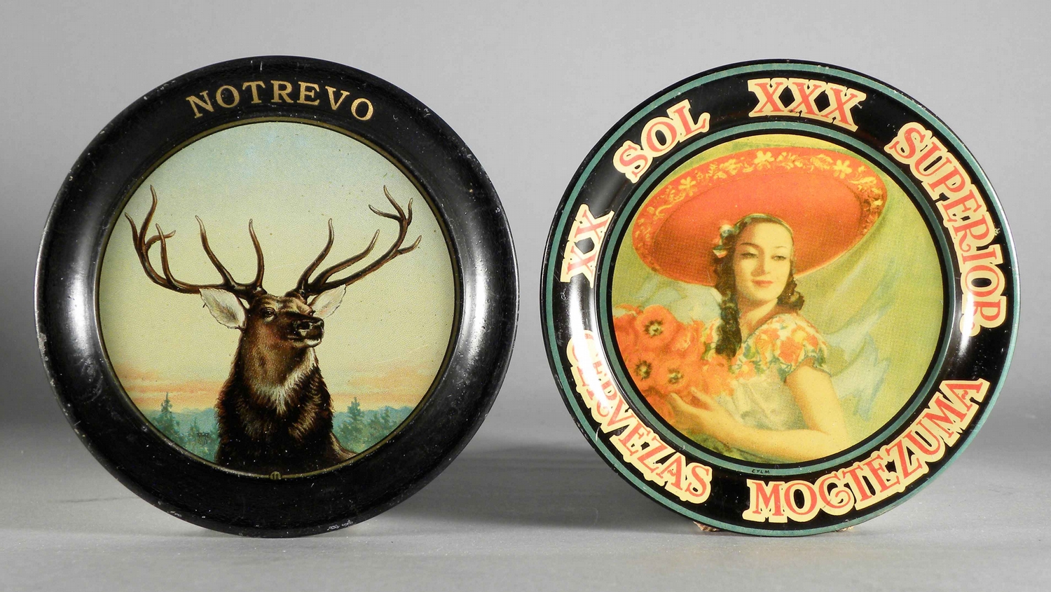 Two Advertising Tin Tip Trays. Sol XXX Superior Cervezas, near mint condition and Notrevo, some very minor edge ware otherwise excellent condition. Each measures 4 1/4 inch diameter