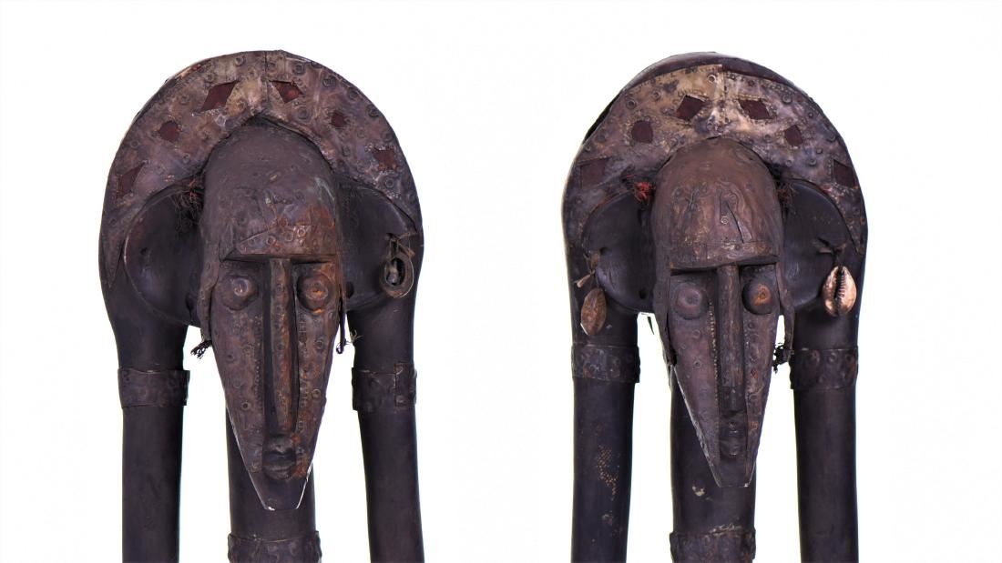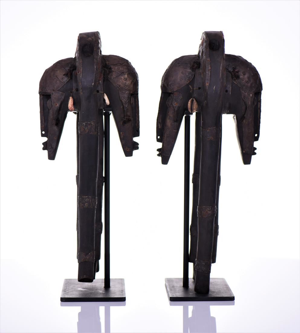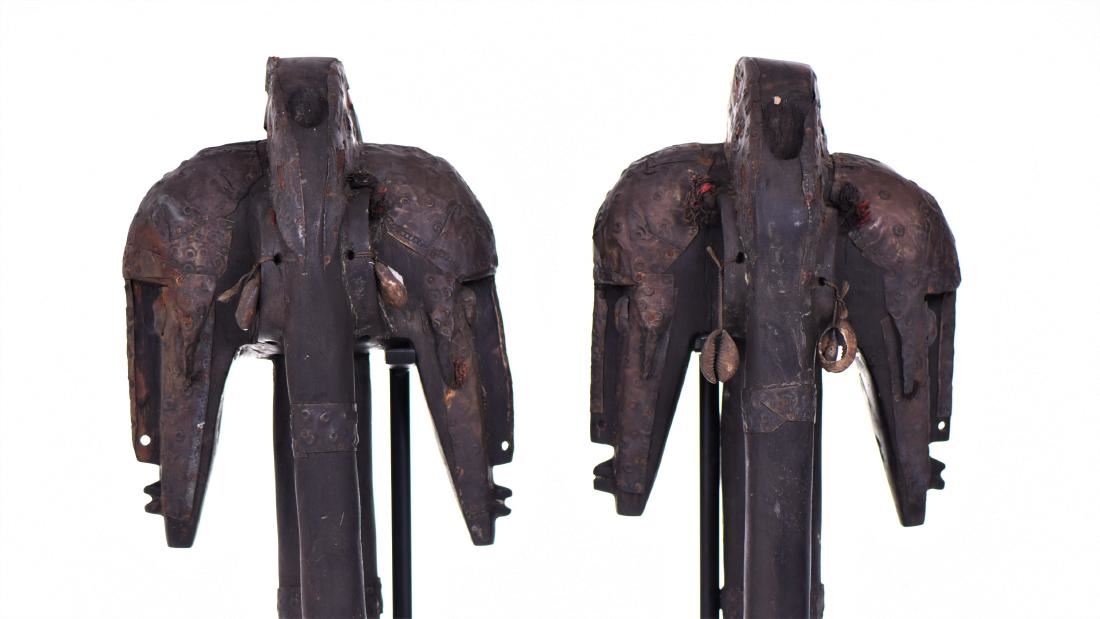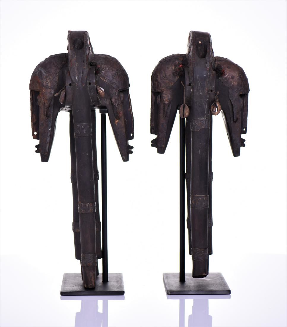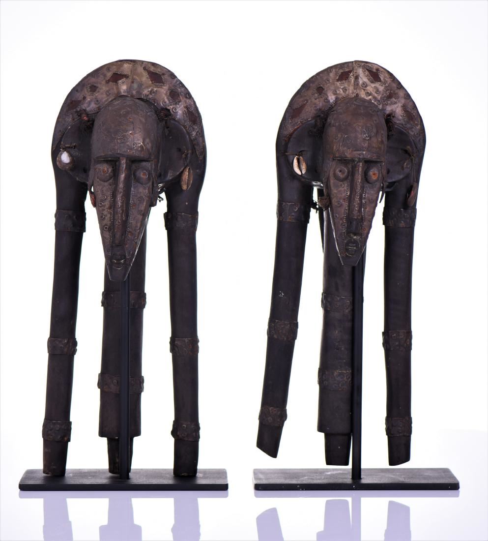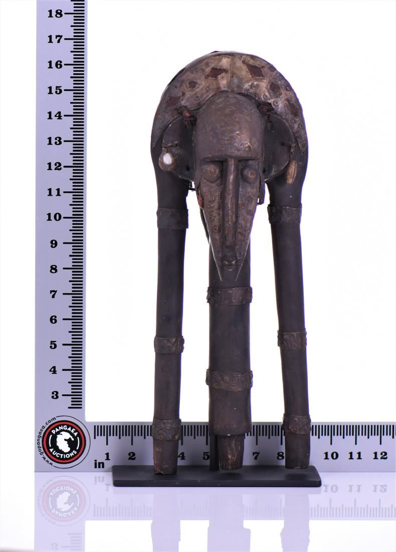 Two African Bambara Marionette's (Puppets), Mali. Carved From Wood And Adorned With Thin Metal And Cowry Shells. Provenance: Ethnographic Tribal Museum Collection (See Auction Catalog Description). Some Lots Have Been On Exhibition And Have A Custom Made Metal Stand Specifically Designed To Fit The Work. Estimated more than 75 yrs old. African art is a term typically used for the art of Sub-Saharan Africa. A few of the most popular traditional African art was produced by the tribal people of the Fang, Dan, Baoule, Dogon, Senoufo, Makonde, Bambara, and San. Most African sculpture was historically in wood and other natural materials that have not survived from earlier than a few centuries ago; older pottery figures can be found from a number of areas. Masks are important elements in the art of many peoples, along with human figures, often highly stylized and in vast variety of styles. Sculpture is most common among "groups of settled cultivators in the areas drained by the Niger and Congo rivers. Direct images of deities are relatively infrequent, but masks in particular were made for religious ceremonies. Later West African cultures developed bronze casting for reliefs, like the Benin Bronzes, to decorate palaces and for highly naturalistic royal heads from around the Yoruba town of Ife, in terracotta as well as metal, from the 12th to 14th centuries. Akan gold weights are a form of small metal sculptures produced over the period 1400–1900; some apparently represent proverbs, contributing a narrative element rare in African sculpture; and royal regalia included impressive gold sculptured elements. Many West African figures are used in religious rituals and are often coated with materials placed on them for ceremonial offerings. Eastern Africans, in many areas shorter of large timber to carve, are known for Tinga Tinga paintings and Makonde sculptures. There is also tradition of producing textile art. Modern Zimbabwean sculptors in soapstone have achieved considerable international success. Southern Africa's oldest known clay figures date from 400 to 600 AD and have cylindrical heads with a mixture of human and animal features. (Wikipedia) Size and/or Weight: See Measurement Photo. (Photos Represent The Lot Condition.)