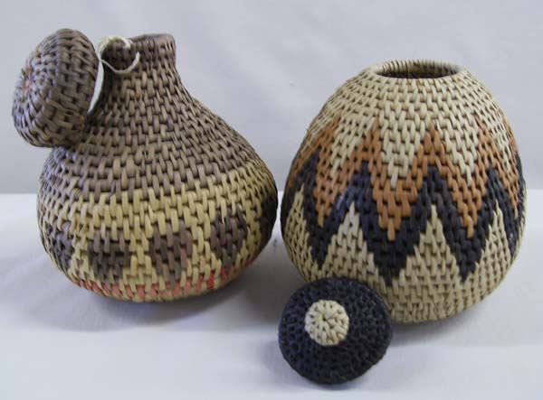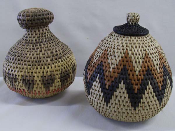 Two African woven jars with lids. Largest 5'' H x 4'' diameter. Buyers pay actual shipping and handling charges.