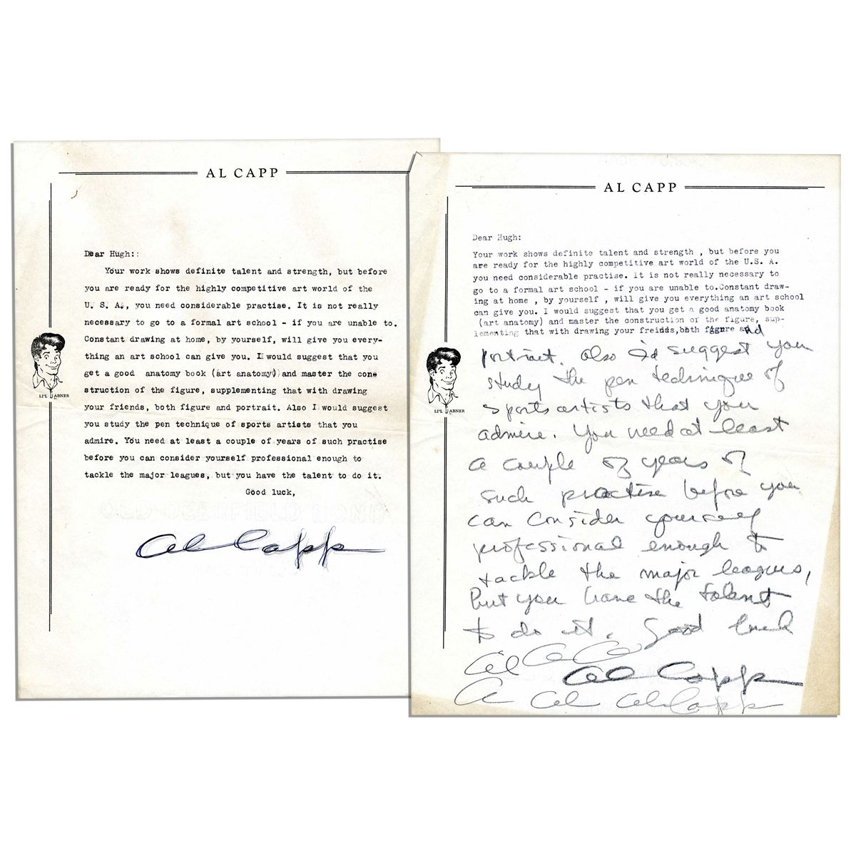 Two Al Capp letters signed. It appears Capp began typing a letter, switched to writing the letter by hand, and then had the letter completely typed on a separate sheet. Upon Li'l Abner stationery, Capp encourages a fan, writing, in part, ''Dear Hugh, Your work shows definite talent and strength, but before you are ready for the highly competitive art world of the USA, you need considerable practise [sic]. It is not really necessary to go to a formal art school - if you are unable to. Constant drawing at home, by yourself, will give you everything an art school can give you. I would suggest that you get a good anatomy book (art anatomy) and master the construction of the figure, supplementing that with drawing your friends, both figure and portrait. Also I would suggest you study the pen technique of sports artists that you admire...Al Capp''. The partially typed letter has been signed ''Al'' multiple times in addition to the full signature. Both single-page signed letters measure 8.5'' x 11''. Toning and creasing, else near fine.
