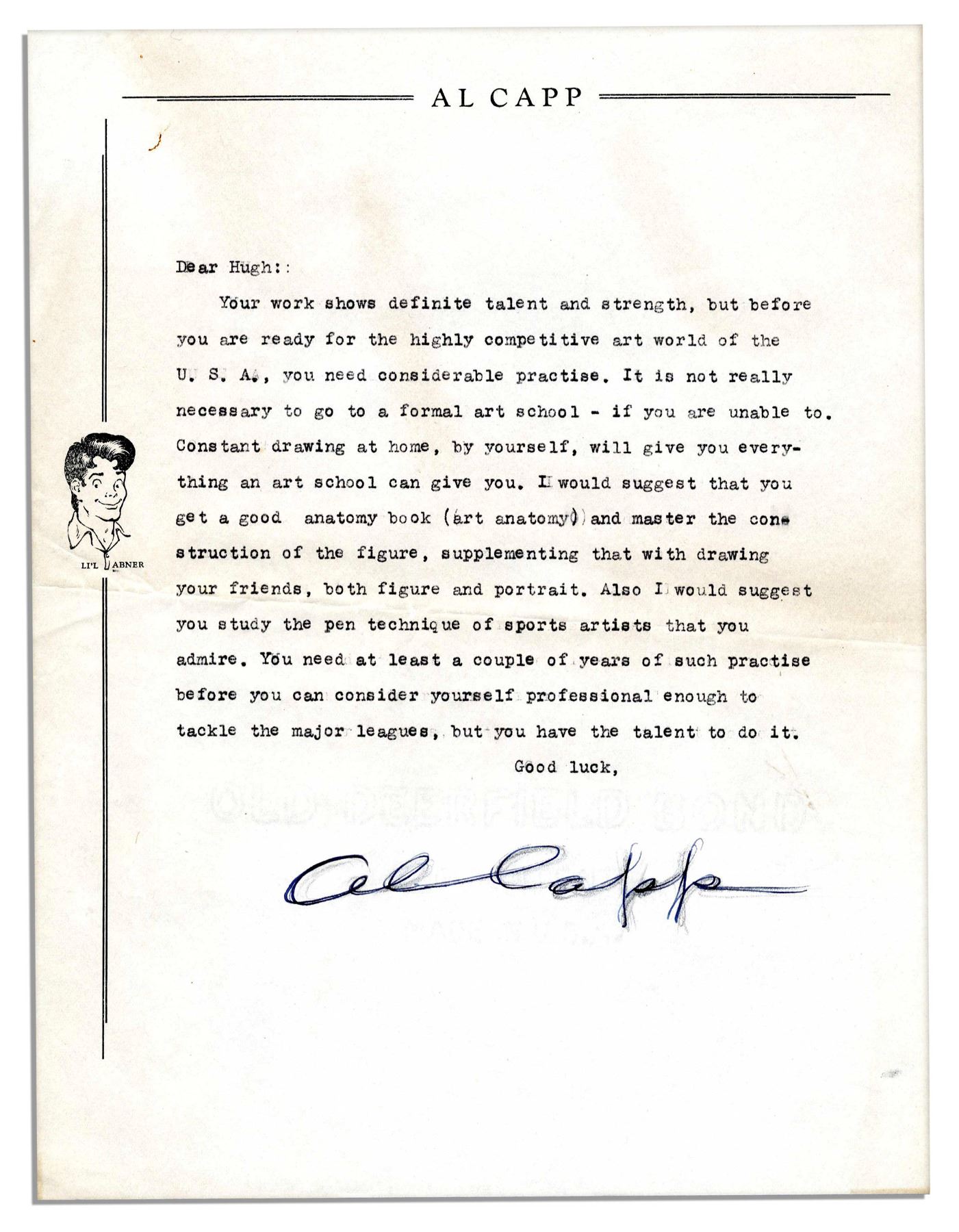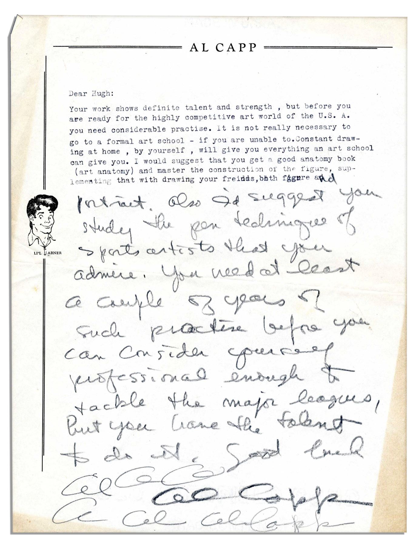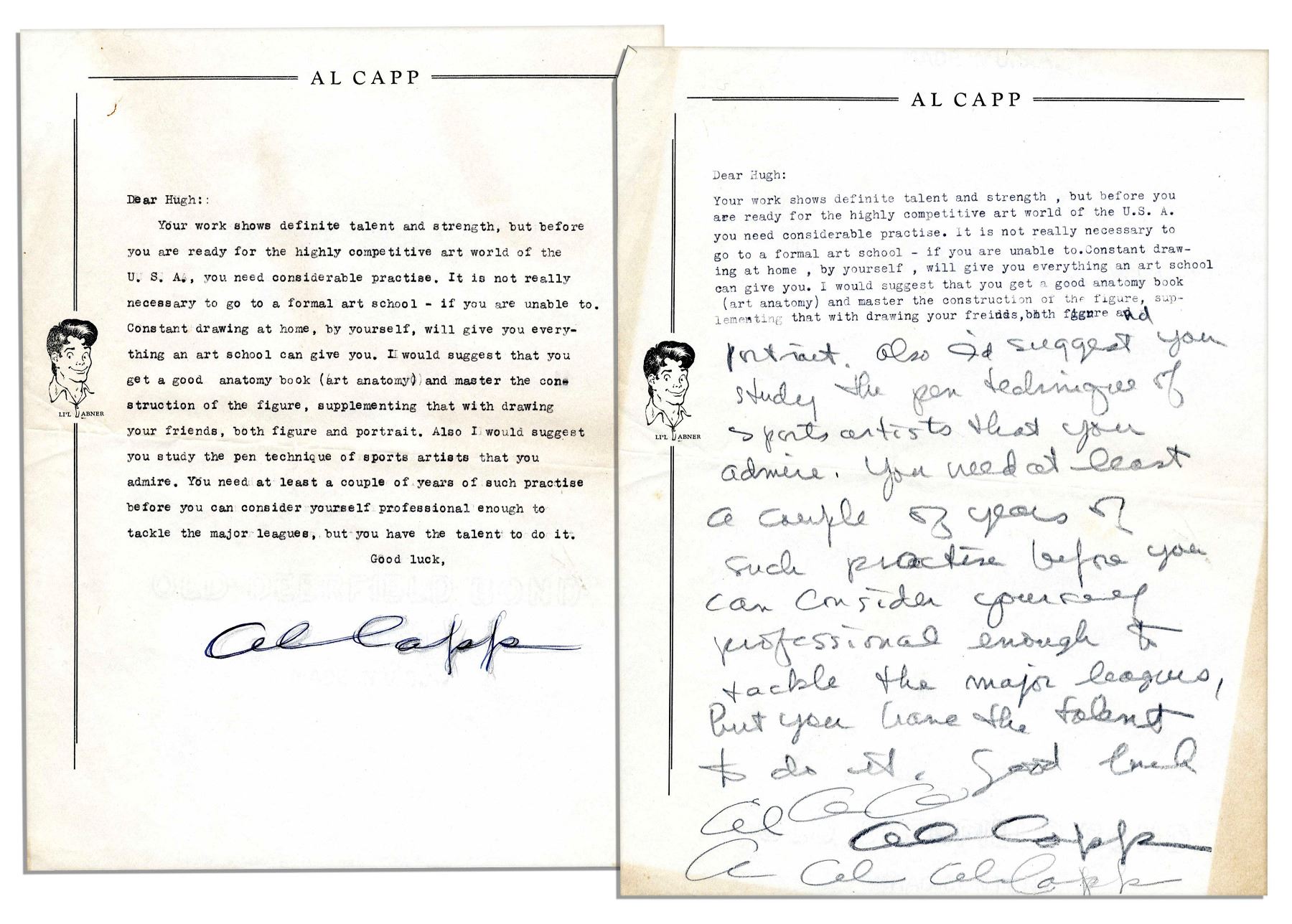 Two Al Capp letters signed. It appears Capp began typing a letter, switched to writing the letter by hand, and then had the letter completely typed on a separate sheet. Upon Li'l Abner stationery, Capp encourages a fan: ''Dear Hugh, Your work shows definite talent and strength, but before you are ready for the highly competitive art world of the USA, you need considerable practise [sic]. It is not really necessary to go to a formal art school - if you are unable to. Constant drawing at home, by yourself, will give you everything an art school can give you. I would suggest that you get a good anatomy book (art anatomy) and master the construction of the figure, supplementing that with drawing your friends, both figure and portrait. Also I would suggest you study the pen technique of sports artists that you admire...Al Capp''. Partially typed letter has been signed ''Al'' multiple times in addition to the full signature. Both single-page signed letters measure 8.5'' x 11''. Toning and creasing, else near fine. From the Al Capp estate.