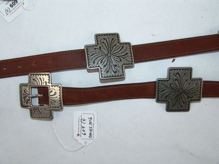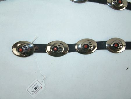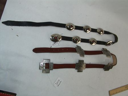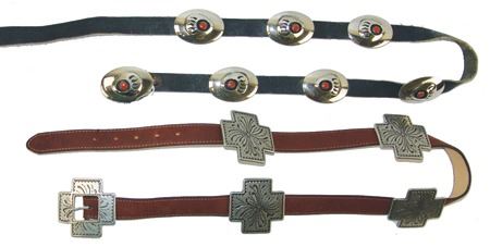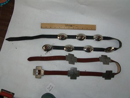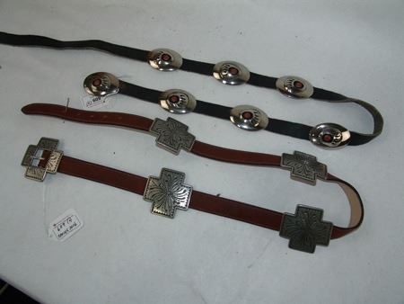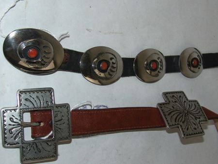 Modern, Including a shiny Navajo shadowbox bearclaw belt with coral stones made with nickel silver (adjustable up to 32" waist), and a cast "engraved" cross belt made from Mexican silver (large-sized). Both in very good condition. Various sizes
