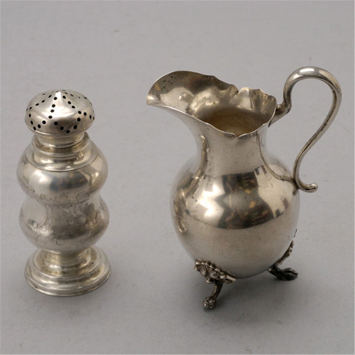 Two American 19th Century Silver Items: a Bigelow Kennard sterling tripod creamer; together with a coin silver shaker with engraved rural figural scene {Total silver weight 6.83 troy oz; height of creamer 5 1/8 inches}