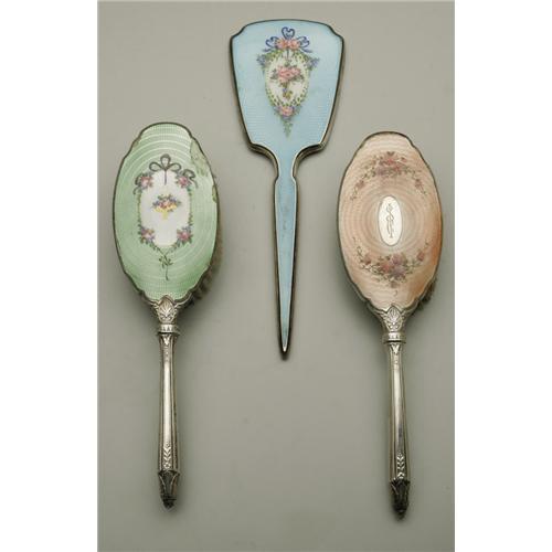 <B>Two American Silver And Enamel Brushes And Mirror Back</B></I><BR><B>Saart Bros. Co., Attleboro, MA; and unknown maker</B></I><BR><BR>The two brushes with hallmarks to the front; the mirror back with an indiscernible hallmark to the front with <I>STERLING/4805</B></I><BR>The mirror back: 10in. long x 3.2in. wide3 Items <BR><BR><B>Condition Report:</B> Normal signs of wear as appropriate with age; the mirror back is missing the glass. The green enamel brush has loss to the enamel which has been touched in.