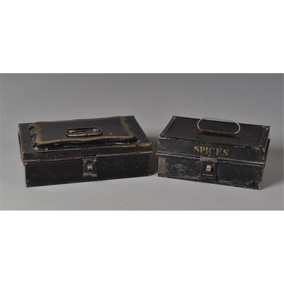 Two American spice tins with handles and latches, smaller tin marked in stencial, "Spice", larger tin to include six smaller tins each finely stenciel decorated with the names of various spices. Circa late 19th century. Largest 10.25"L x 6.5"D x 3"H. Private collection Gregory, MI.