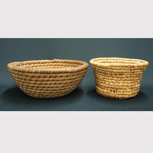 Two American coiled baskets; late 19th to early 20th C.; 6" high x 16" diameter (damage to top rim); and 6 1/2" high x 11" diameter