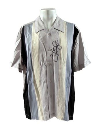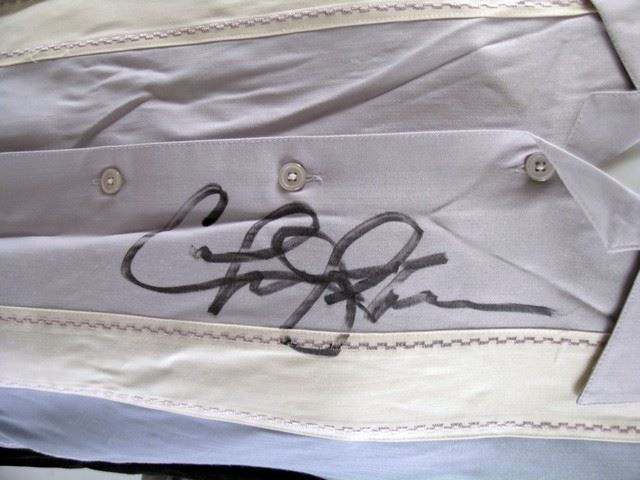 From the hilarious comedy Two And A Half Men (2003 to present) is Charlie Sheen's screen used autographed black, white and light blue 'Sobrino' collared shirt. This is autographed very clearly on the front. (size XL)