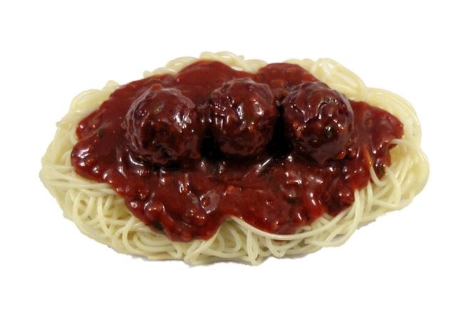 Two And A Half Men Rubber Spaghetti And Meatballs Prop - If you think "ketchup, hotdogs and Spaghetti", you think of Jake and TV's "Two and a Half Men". However in most cases the classic was served with meatballs. This is an extremely realistic rubber spaghetti and meatballs prop used in the series. (Approx. 8" long).