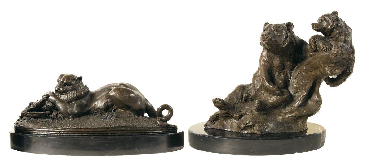 1) Panther and alligator statue by Jules Moigniez (1835-94) modeled after Antoine Louis Barye's "Tigre Devornat Un Gavial". 2) Pair of bears statue signed by Antonie Louis Barye (1796-1875). Excellent with some minor handling marks on bases.
