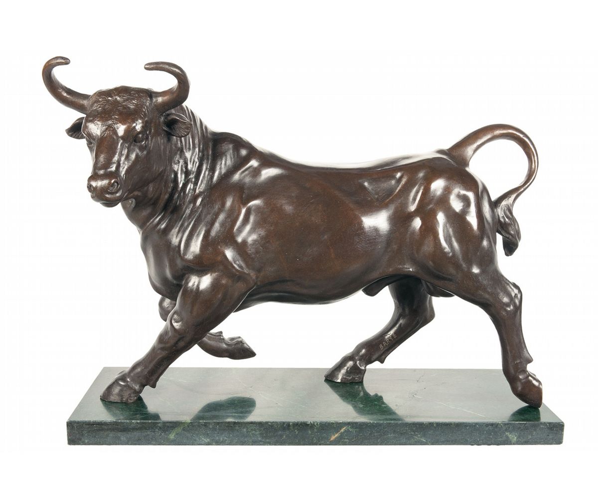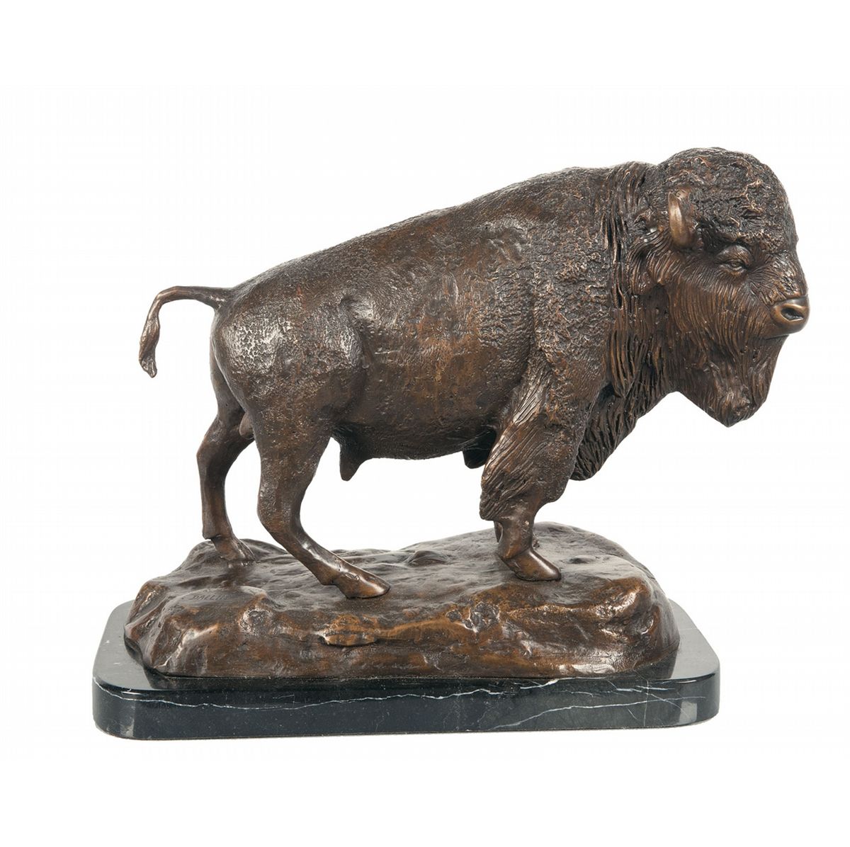 1) Attributed to George Gardet (1863-1891). Massive bull highly crafted by a skilled sculptor that shows the bull's head slightly askew to the left. The dynamic muscular animal is one in the same manner and era of the classic French animalier sculptors of the 19th Century. The bull rests on a separate and not attached rectangular black marble plinth. 23"x9"x17" 30 lbs. Very good. 2) Cyrus Edwin Dallion's standing American buffalo bronze with finely chiseled hair and mane looking forward for danger or food. He stands on an elevated bronze plateau which has a custom black marble plinth. Signed on the base. 16"x7"x12". Very good.