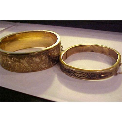 These bracelets are rolled gold plate. Two thin layers of gold sandwiched in a base metal center. The engraving is in antique condition and is quite ornate. The bangles are antique condition; many of these classic bangles have been abused through constant wear, these show some sign of wear. Circa 1910