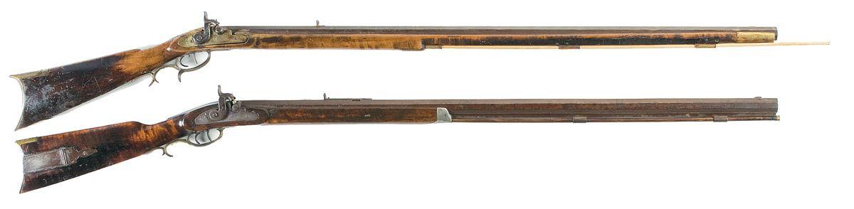 A) Fixed sights, Cincinnati address on brass lock plate, drum conversion, brass forearm tip, replacement ramrod, double set triggers and brass buttplate.