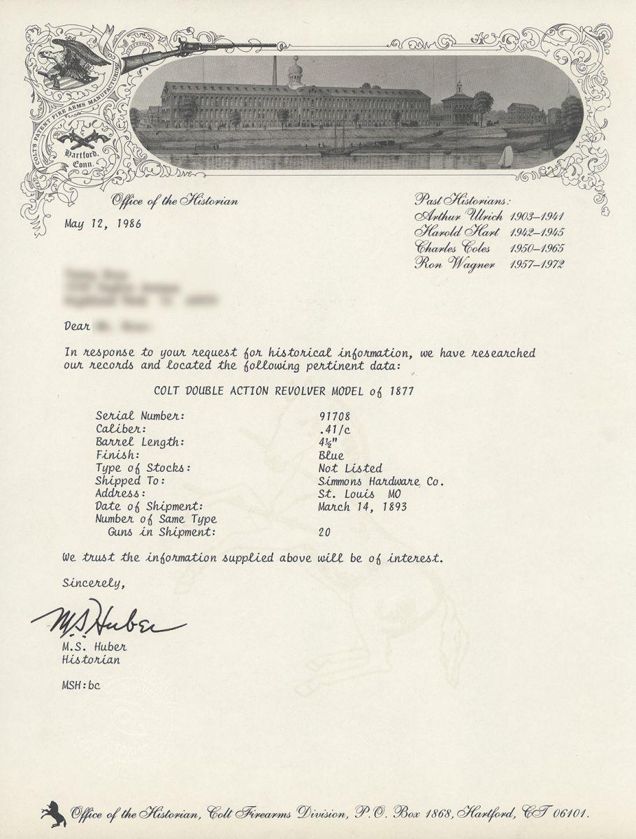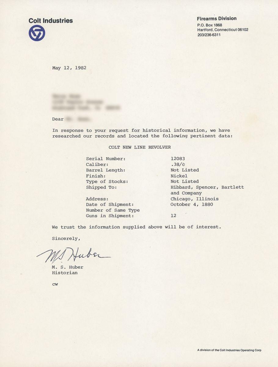 B) Manufactured in 1880. Standard markings and features. Barrel etching very faint. Accompanying factory letter verifies serial number, caliber and finish, with the barrel length and grips "Not Listed", and that the gun was shipped to Hibbard, Spencer, Bartlett and Company in Chicago, Illinois on October 4, 1880 in a shipment of 12 guns.