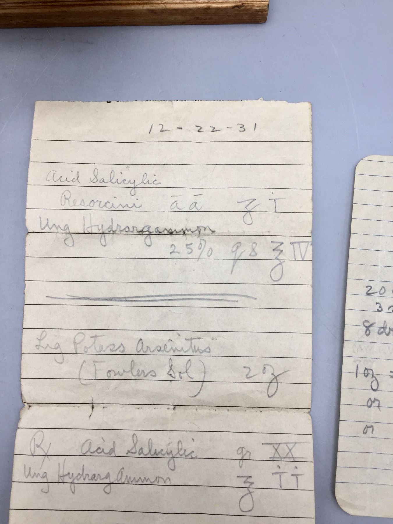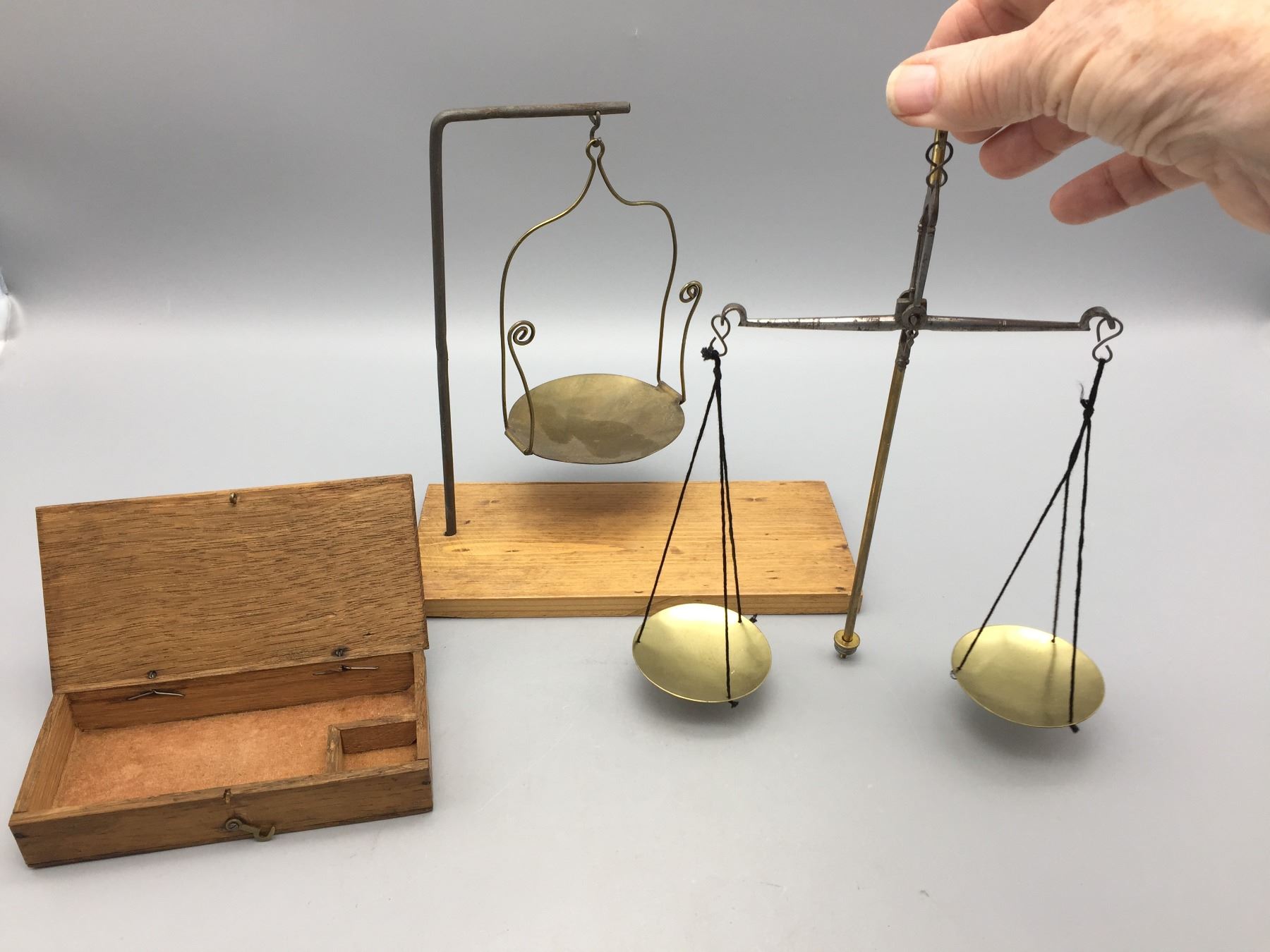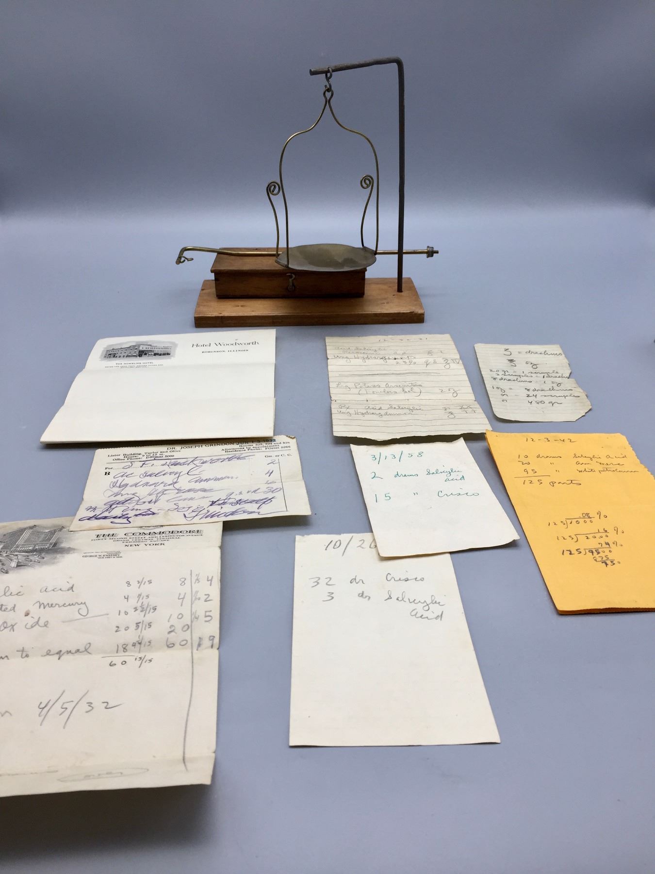 Description: Included for sale in this lot are two antique gem scales. There is a box with some old, dated paperwork which appears to have been from a Pharmacist, who may have previously used the scales to measure out medications.