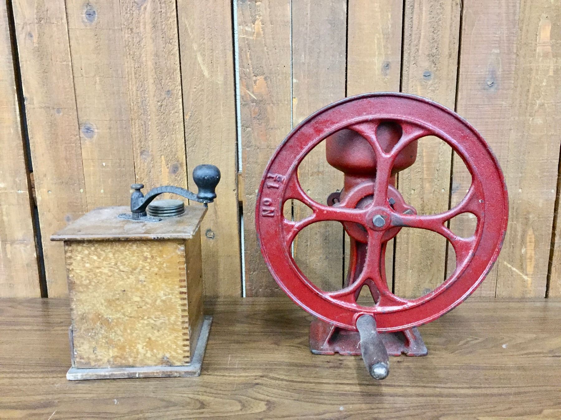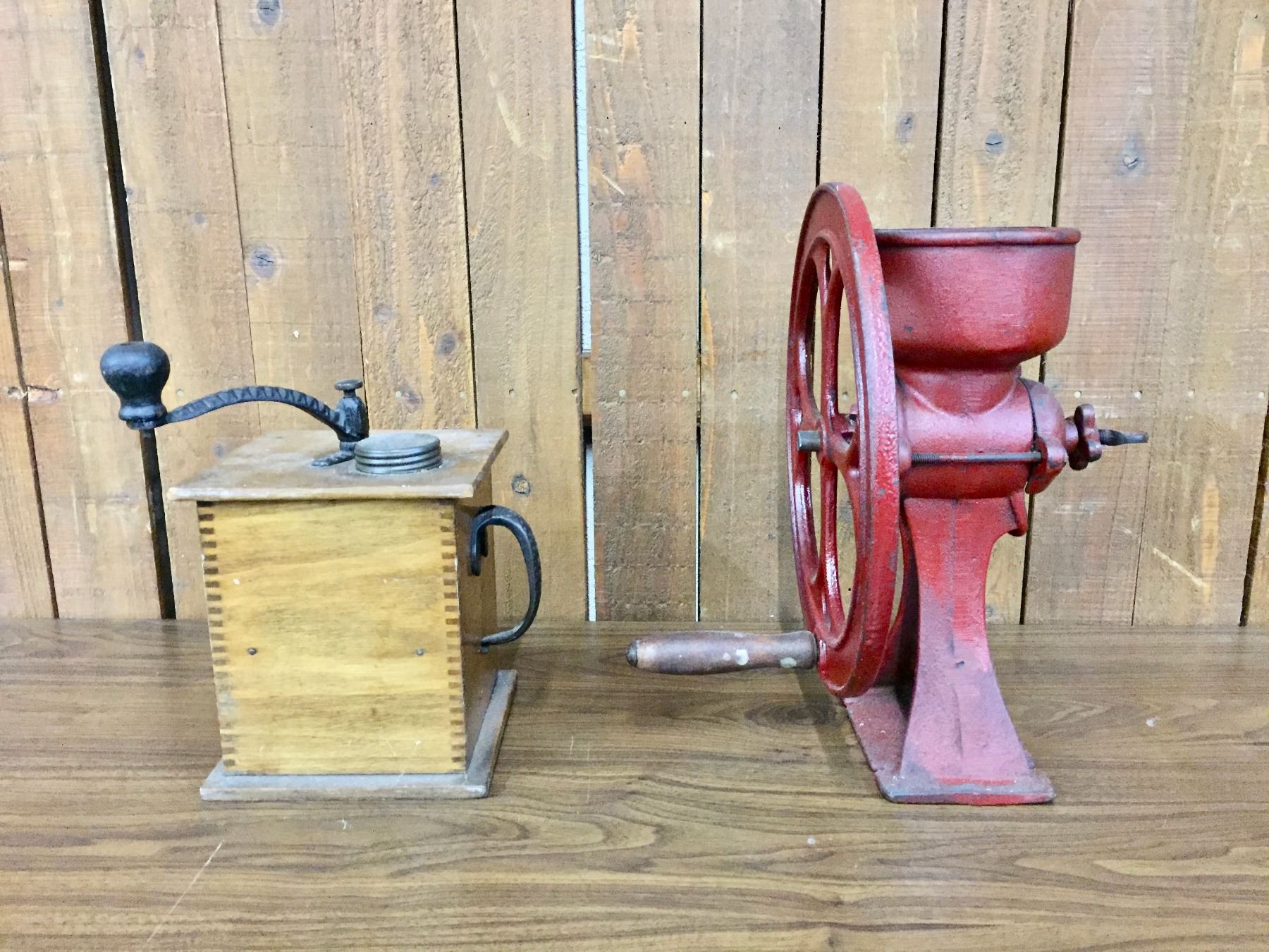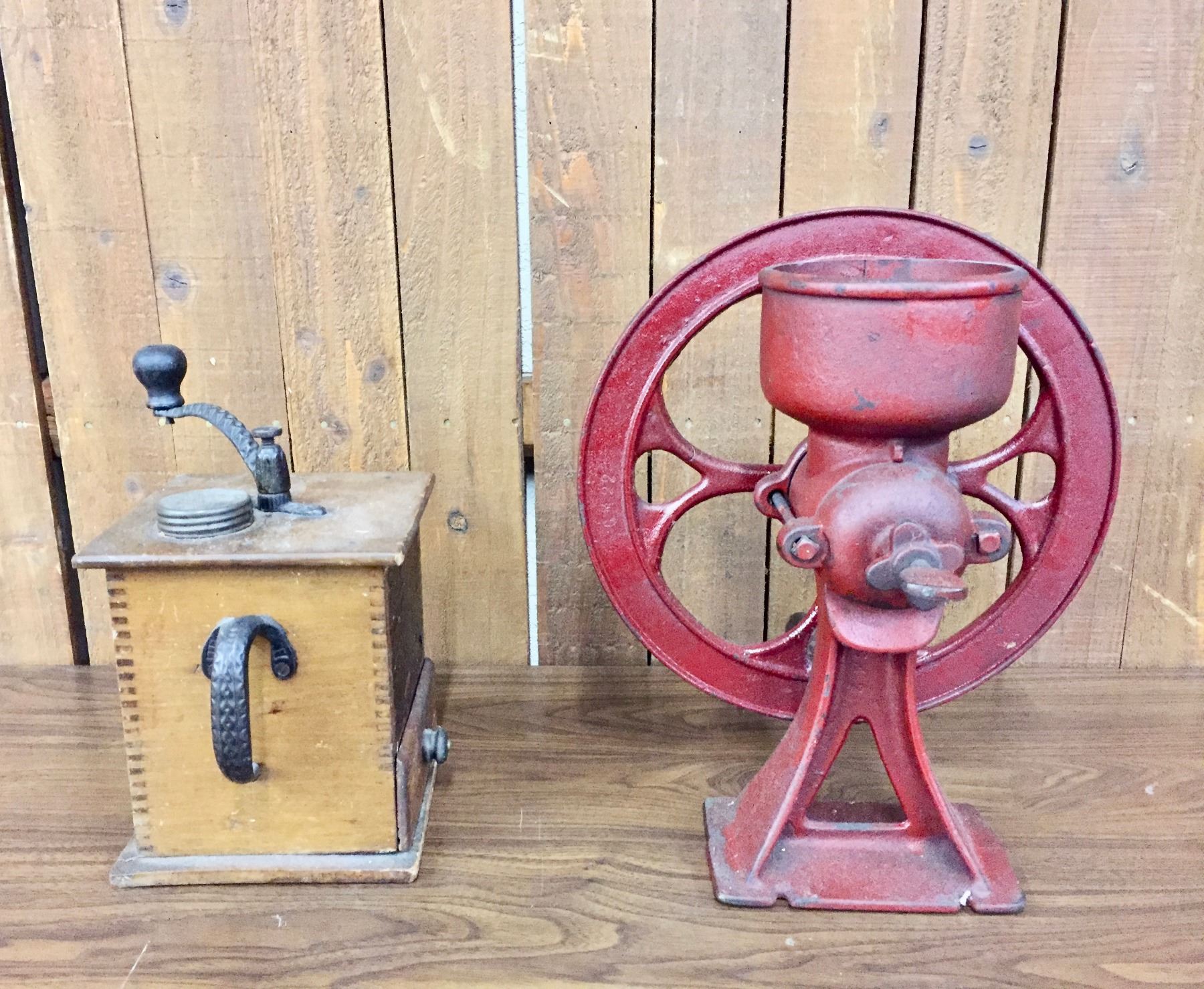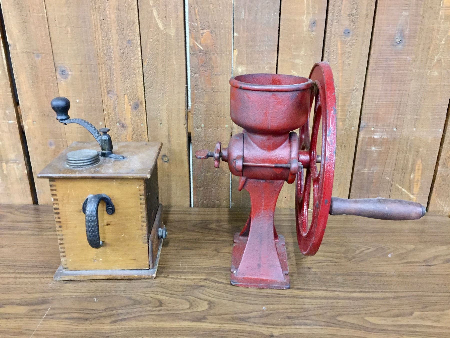Description: Included in this lot are two antique grinders, one is an old coffee grinder the other all metal one is an old multi-purpose grinder.
