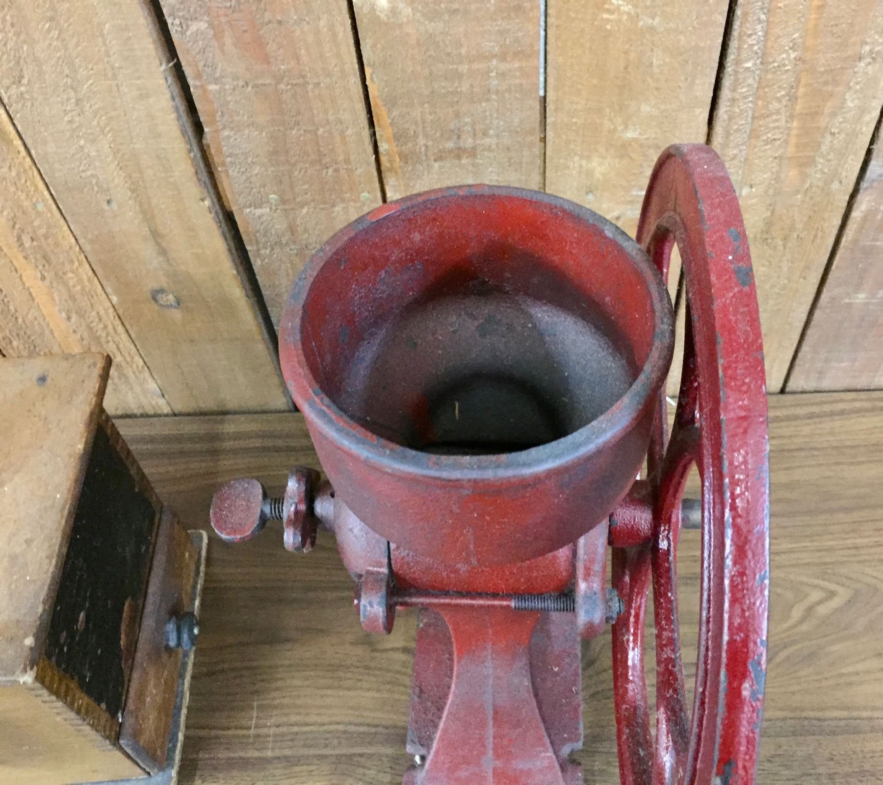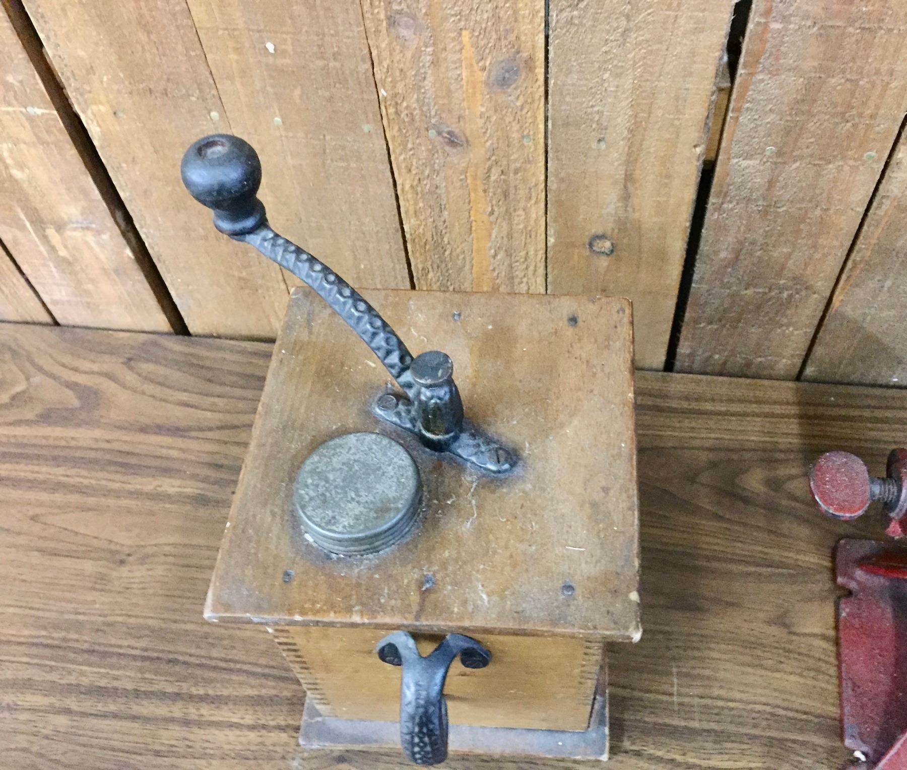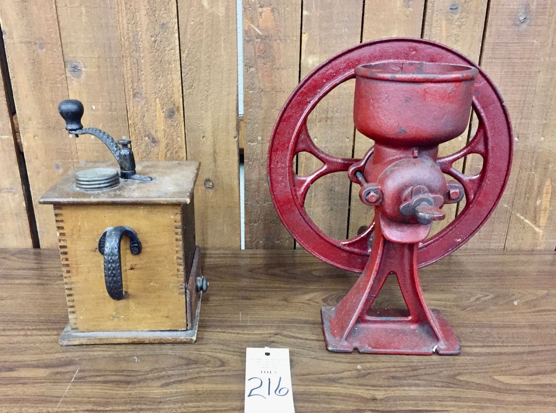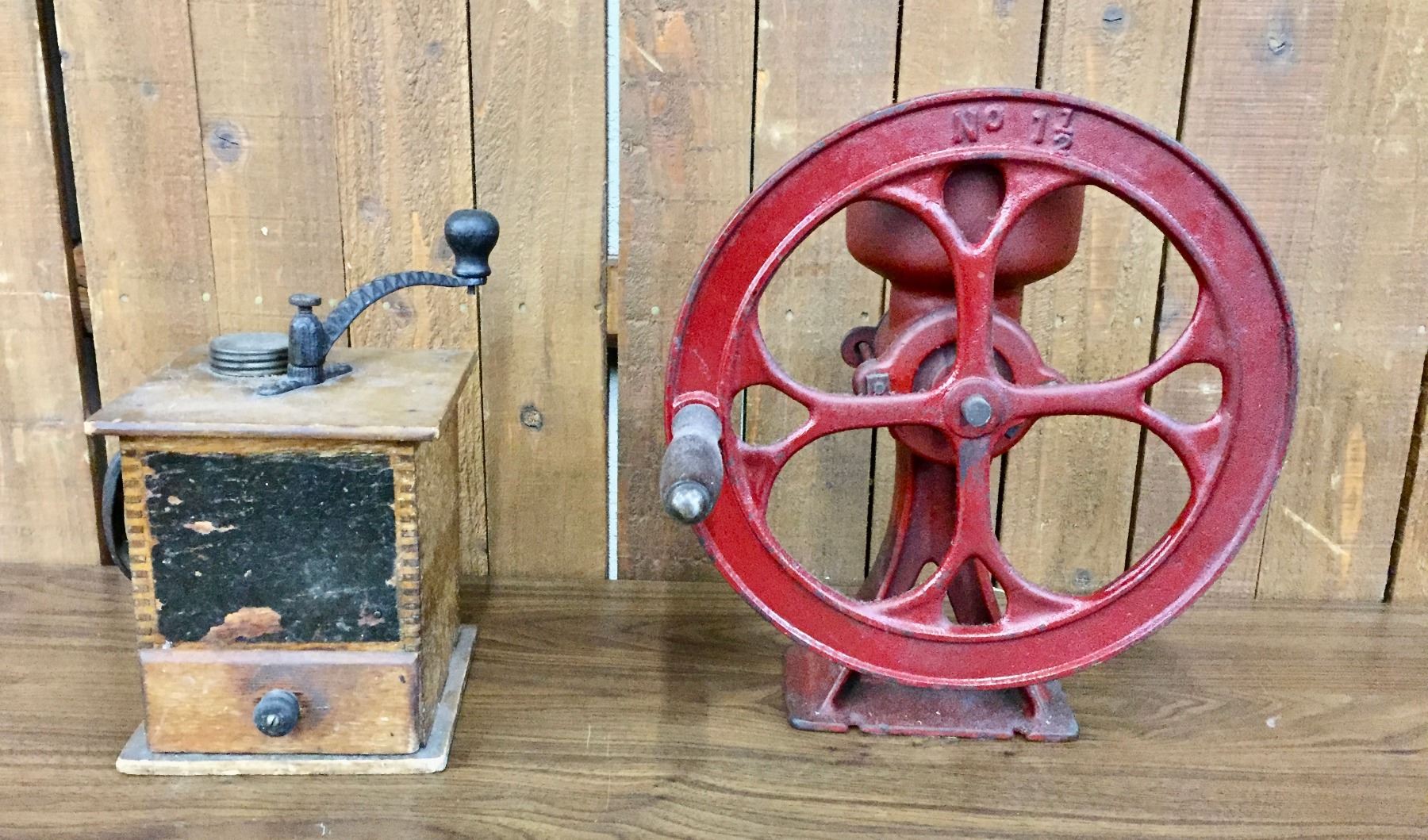 Description: Included in this lot are two antique grinders, one is an old coffee grinder the other all metal one is an old multi-purpose grinder.