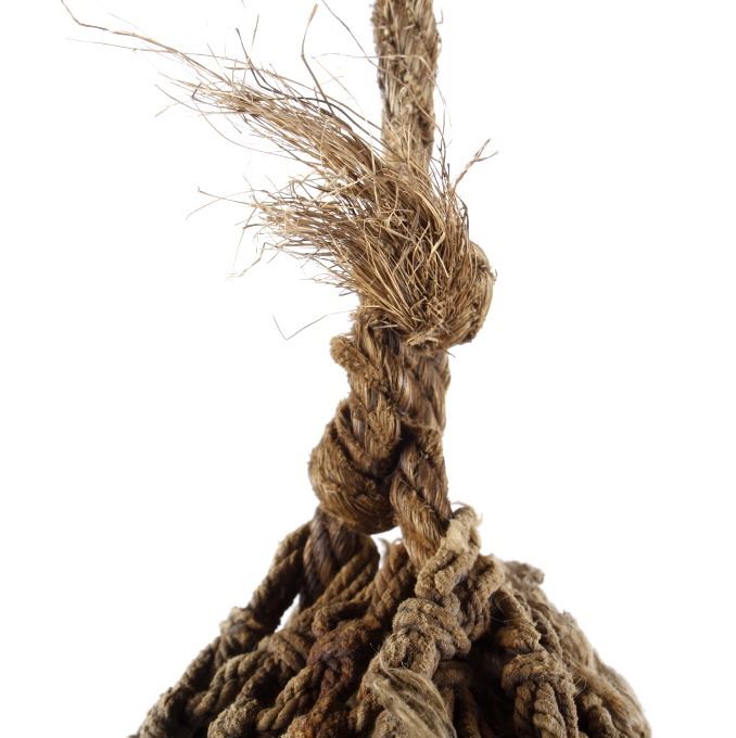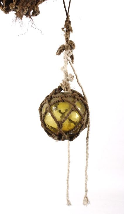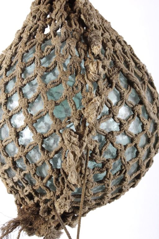 Available for your consideration is a large aqua blue Japanese Glass Fishing Float, with a smaller yellow float attatched. These floats were used to give buoyancy to fishing nets, long lines, and drop lines. These fishing buoys originate from as early as the 1840's - Invented by a Norwegian merchant Christopher Faye, and modernized shortly after by Hadeslands Glassverk. The buoys are referred to as "Japanese glass floats" because most all of the remaining glass floats that exist today originate from Japan, and their ever-booming deep sea fishing industry. These floats are believed to originate from the mid-20th century, and shows good condition. There are some tears to the rope netting, and the rope attaching the smaller float appears to be a more modern addition. The larger float measures 8" x 7".