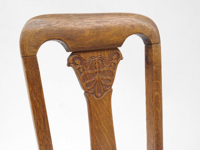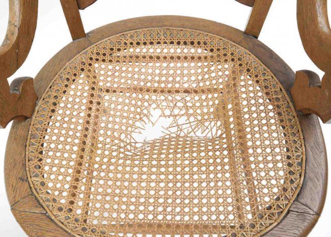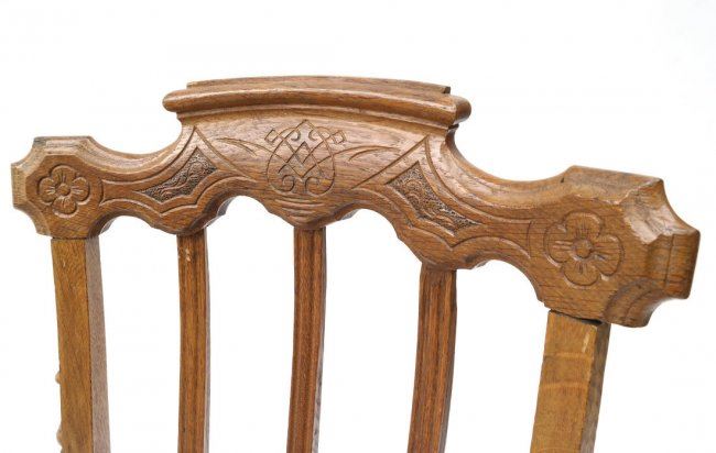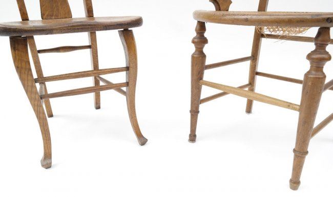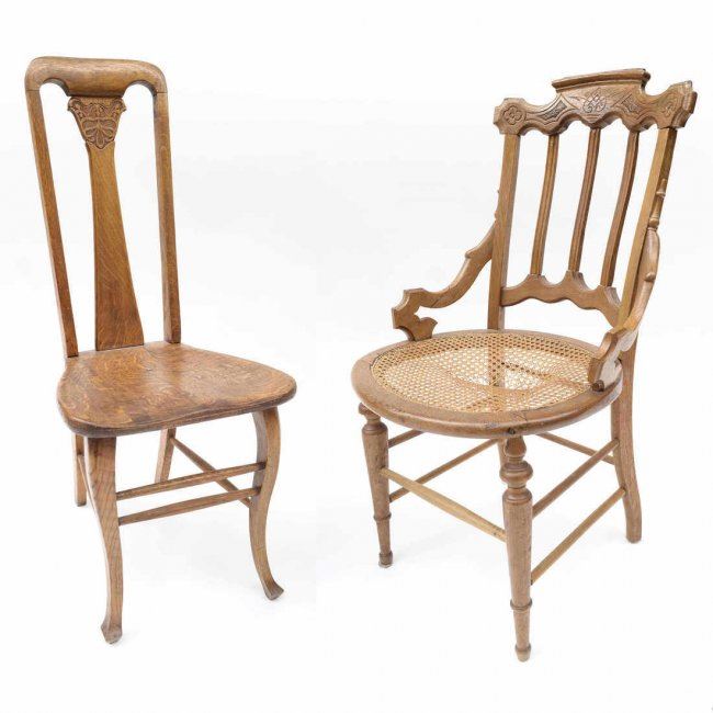 Comprises: 1.) Oak side chair with detailed crestrail and cane seat. [17" W x 16" D x 36" H]. 2.) Queen Anne-style oak chair with center splat. [16" W x 15" D x 39" H]. In fair condition, legs loose.
