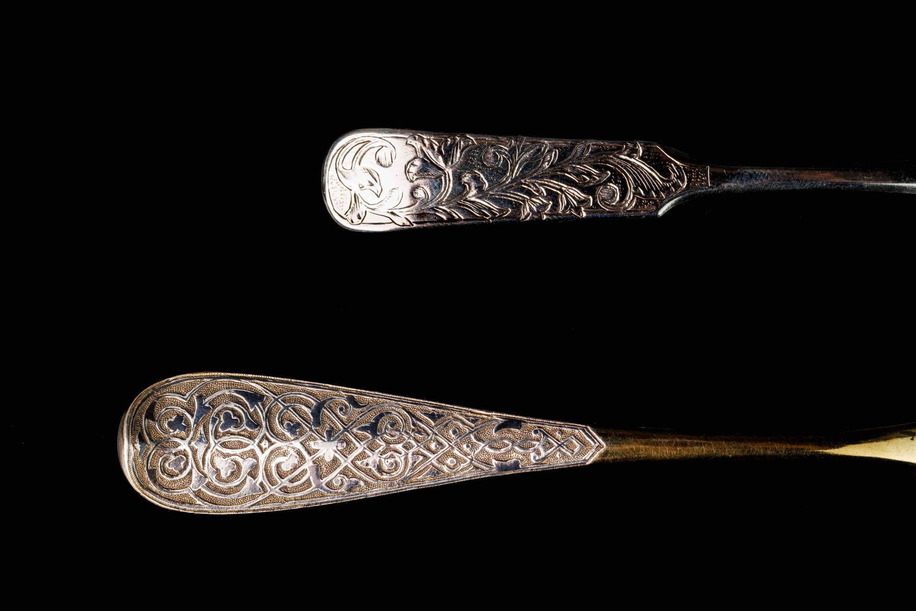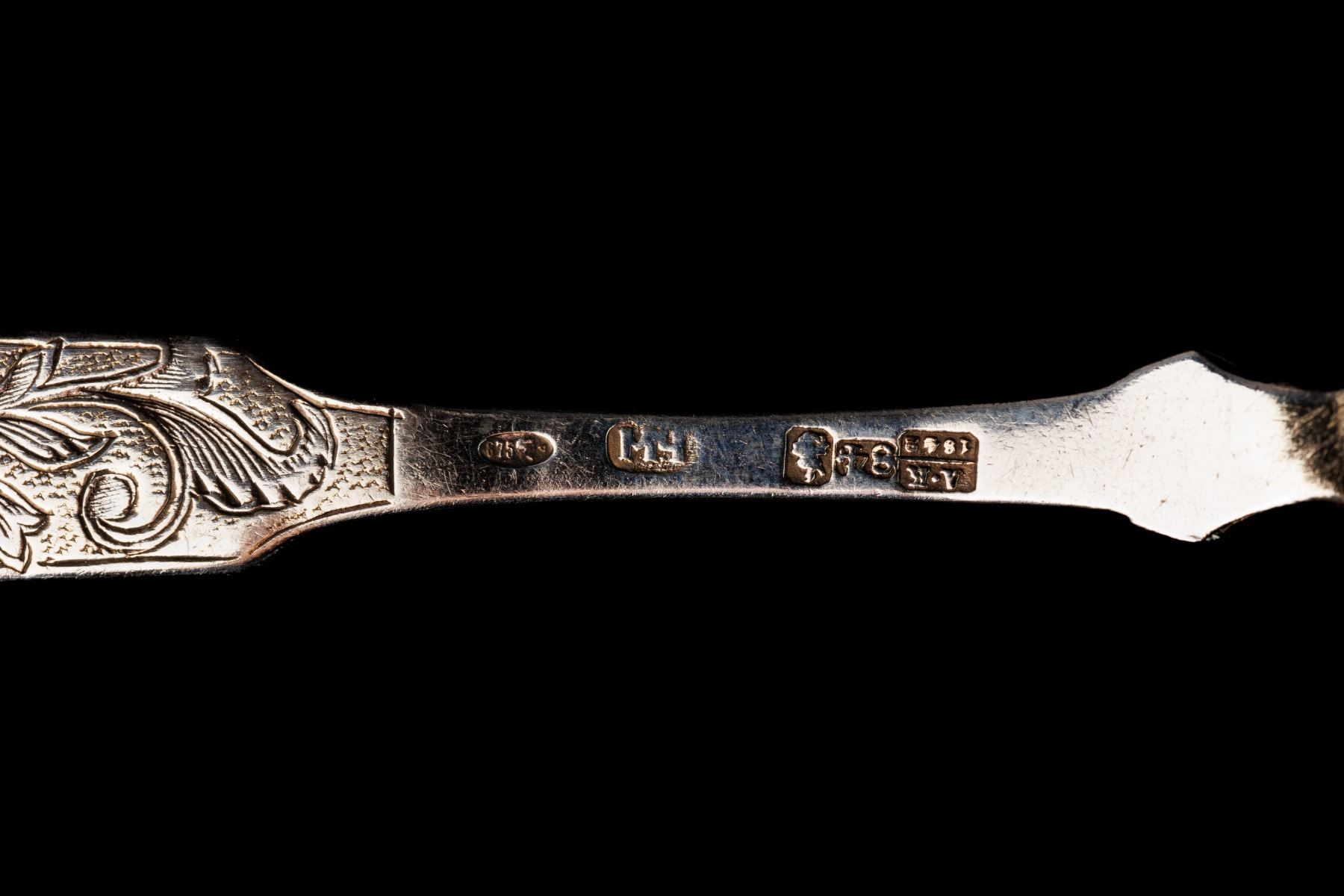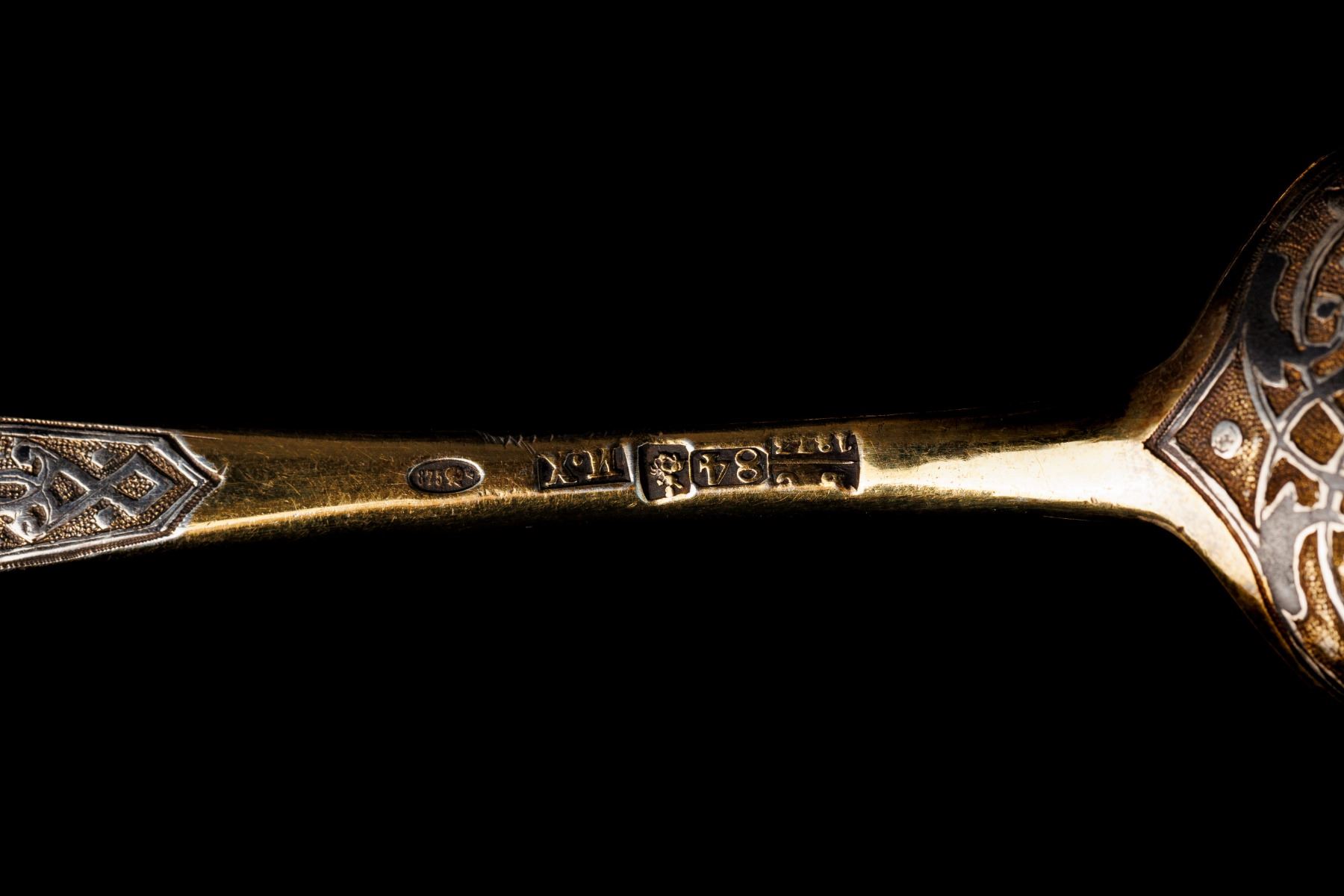 1. Dessert spoon - gilding, niello. Niello condition - with losses. 1873 year, Moscow, Russian Empire. Manufacturer I.H. (Ivan Khlebnikov). The period of reign of Alexander II. The size 17,5 cm and weight 50 gramm