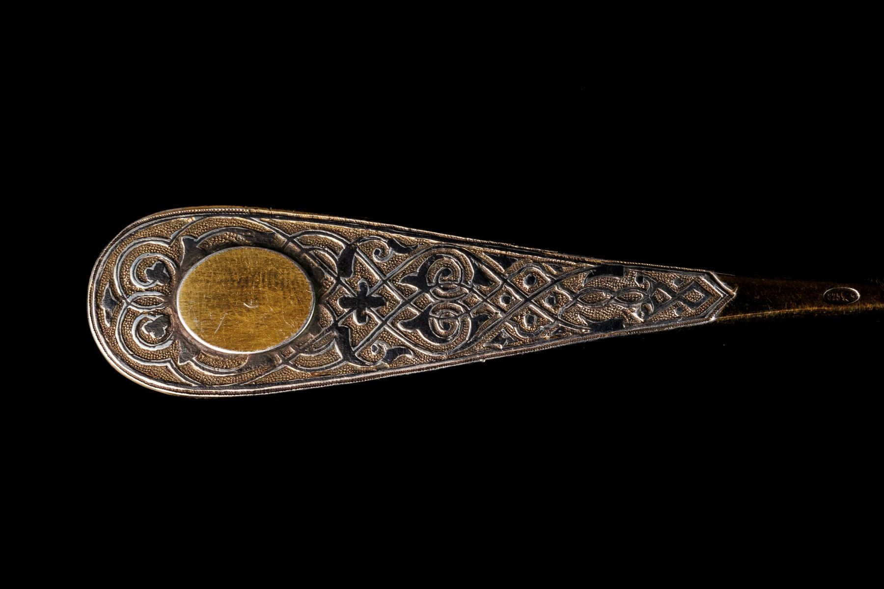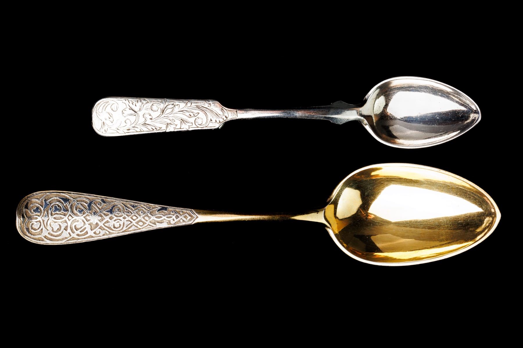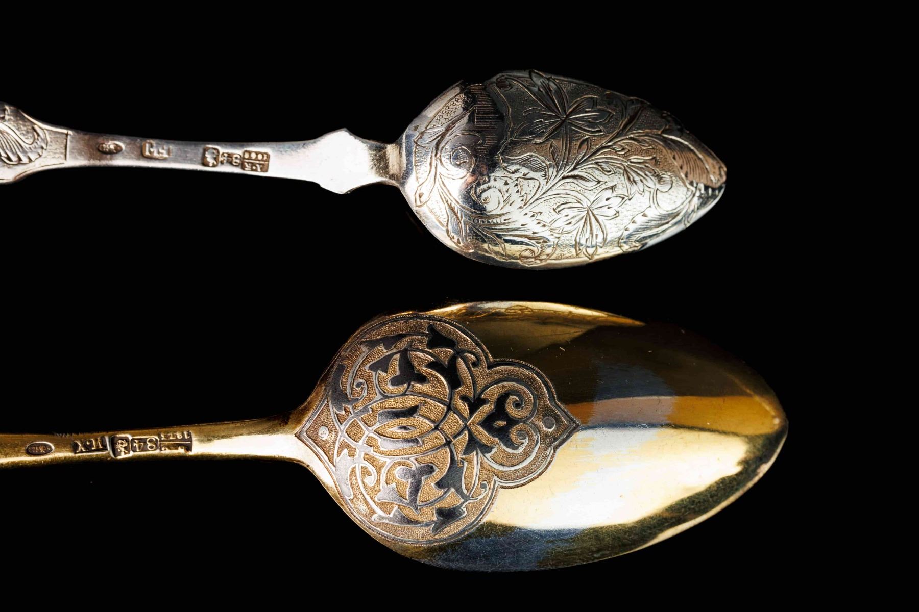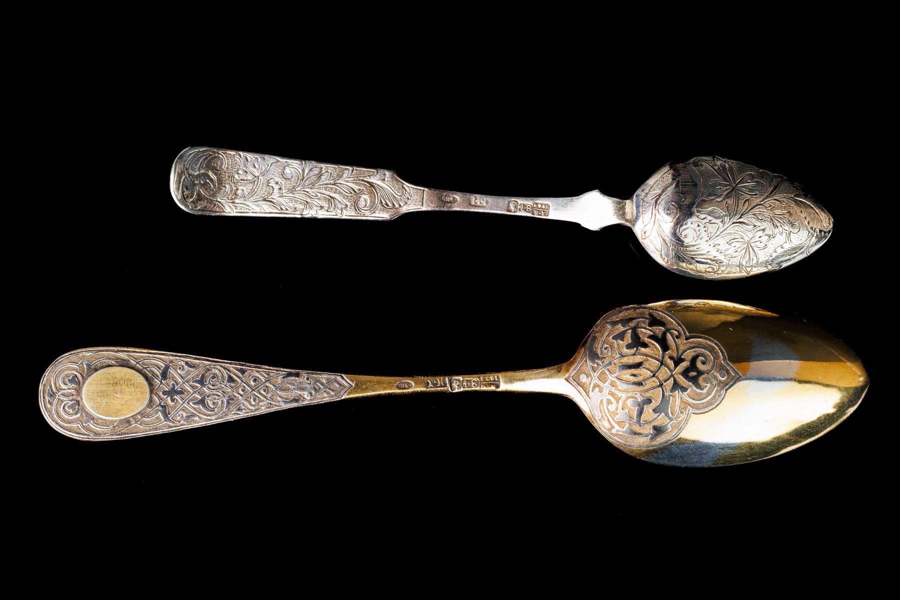 1. Dessert spoon - gilding, niello. Niello condition - with losses. 1873 year, Moscow, Russian Empire. Manufacturer I.H. (Ivan Khlebnikov). The period of reign of Alexander II. The size 17,5 cm and weight 50 gramm