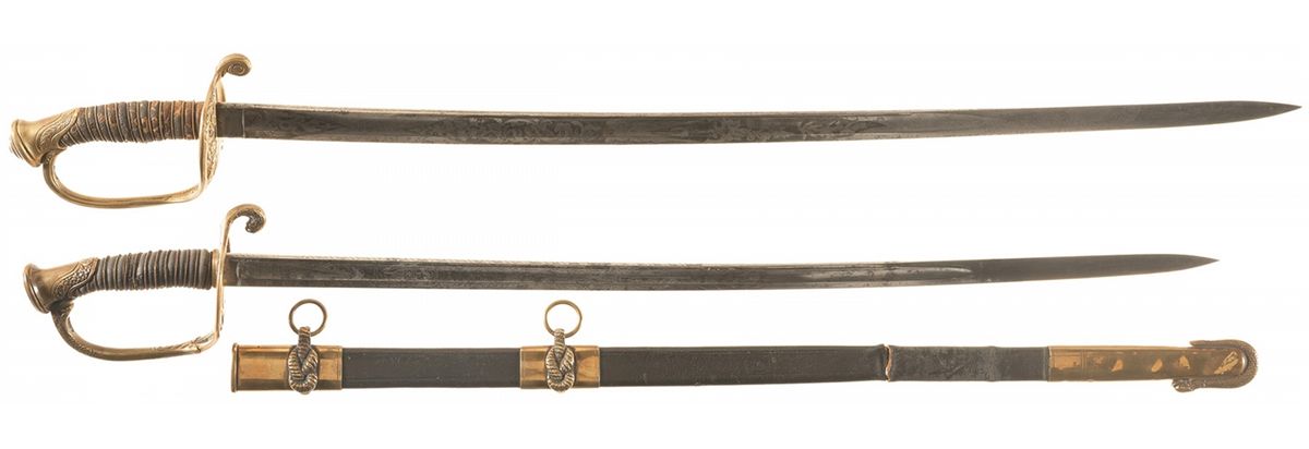 1) Collins/Tiffany 1862 sword, 38" long, 32" etched double fuller blade, brass guard, wire wrapped sharkskin grip. 2) Weyersberg Production U.S.N. Sword, 35" long, 29 1/2" double fuller etched blade with Horstmann merchant marks, wire wrapped sharkskin grip, and a leather and brass scabbard. Scabbard damaged, otherwise lot is fair.