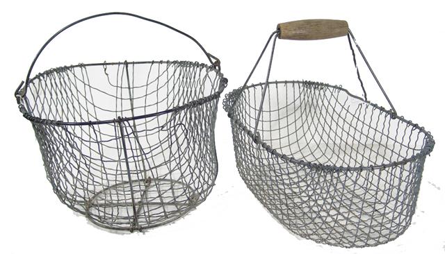 Early 1900s, Pair of unique hand woven farm baskets constructed of hard wire. Larger 13-1/2" x 18-1/2" x 11"