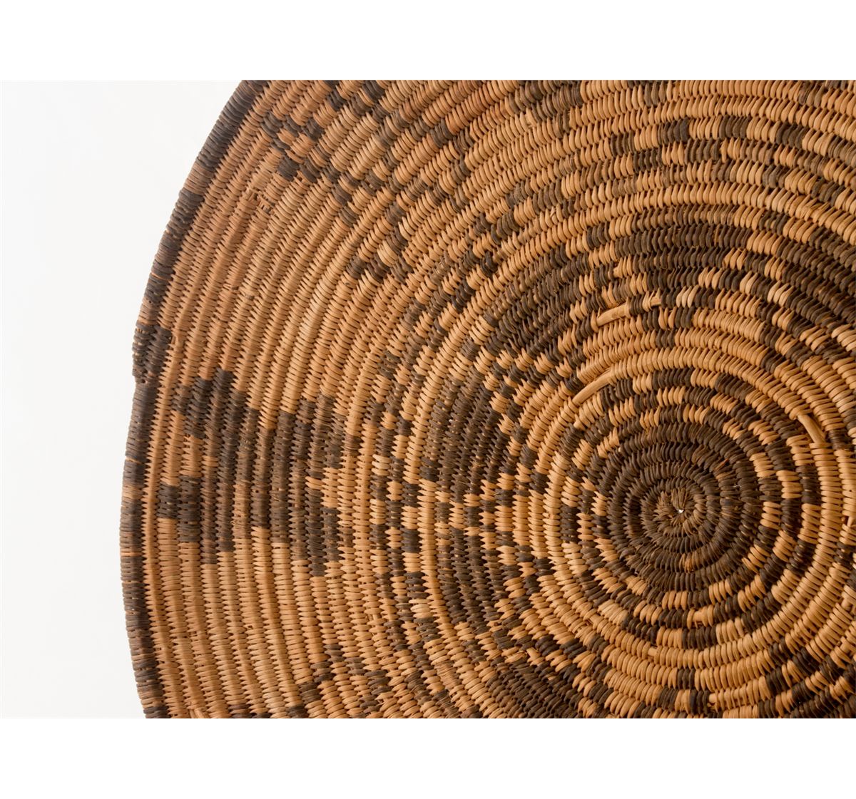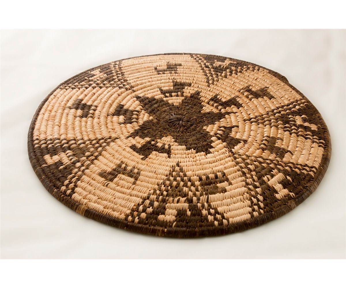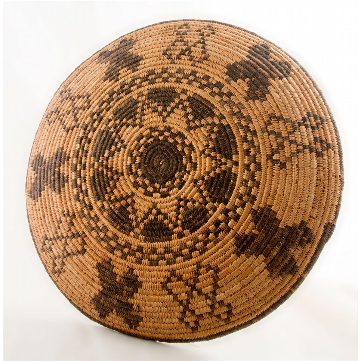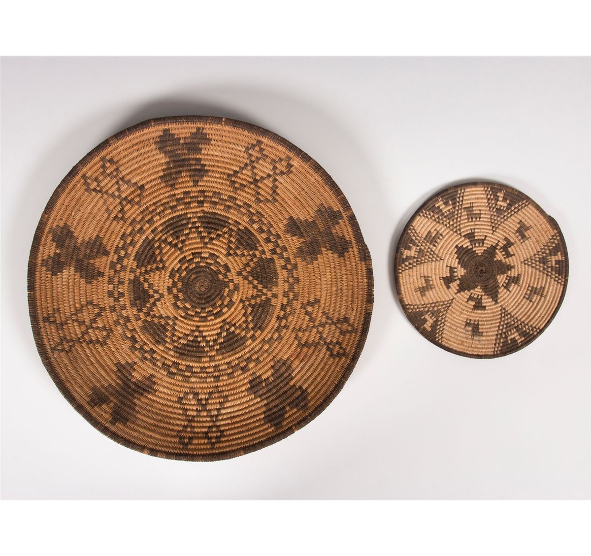 Two Apache Basketry Trays; 1. 10" diameter with seventeen positive and negative dog designs and a snowflake element. 2. 18.5" diameter with snowflakes, checkerboard and butterfly designs. Both circa 1920s.