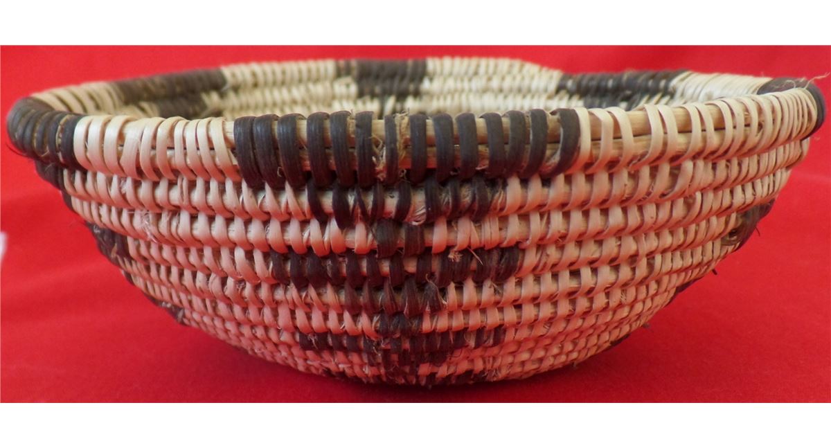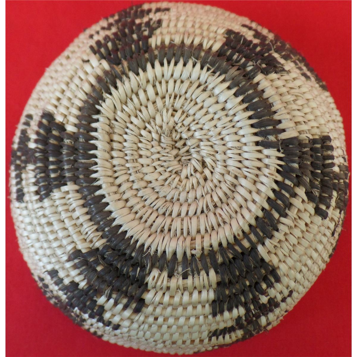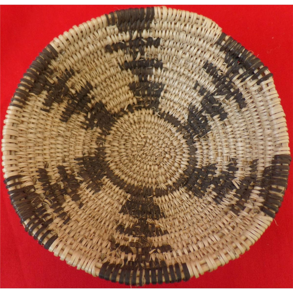 Two Apache Baskets, New Mexico measuring the small one 5 inches and the larger one 10 inches. They were found in cave in New Mexico and date from the 1900 to 1930's. They are made from willow and devils claw. The larger basket has some fading and stitch loss, the smaller one is in good condition. Shipping $20.00