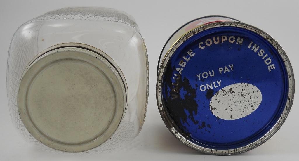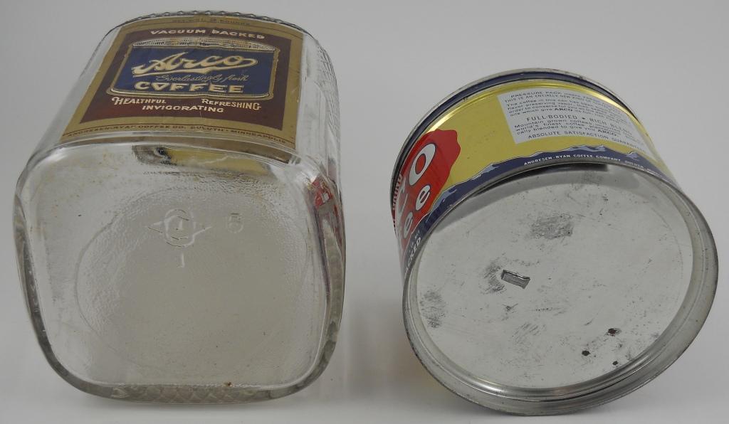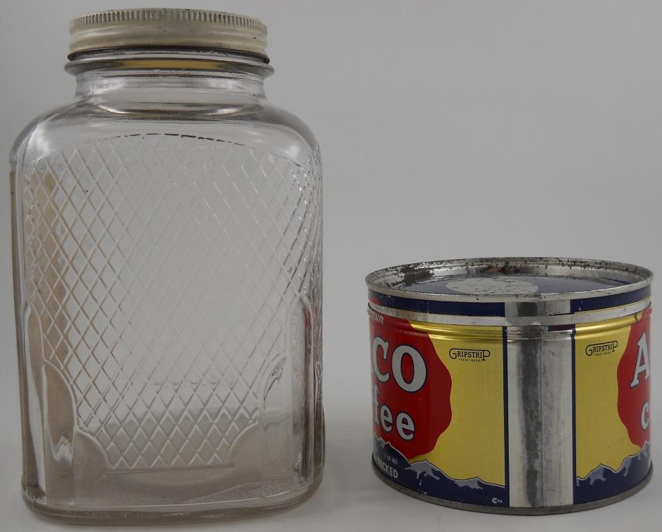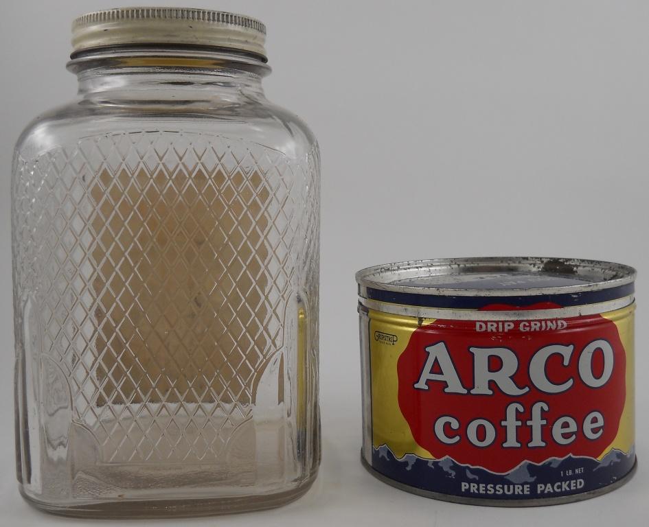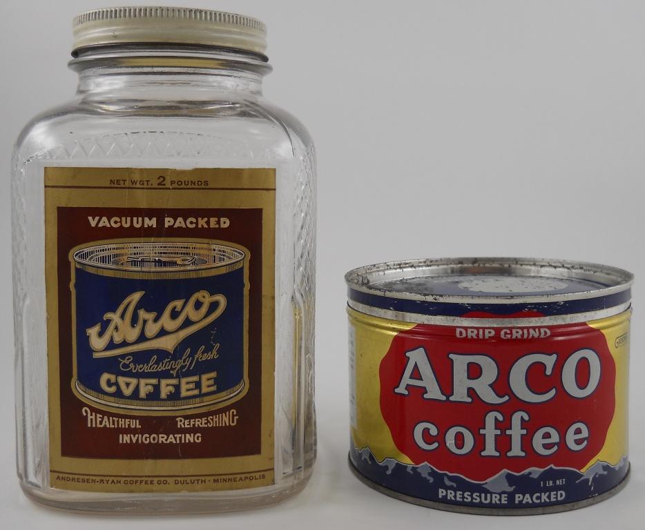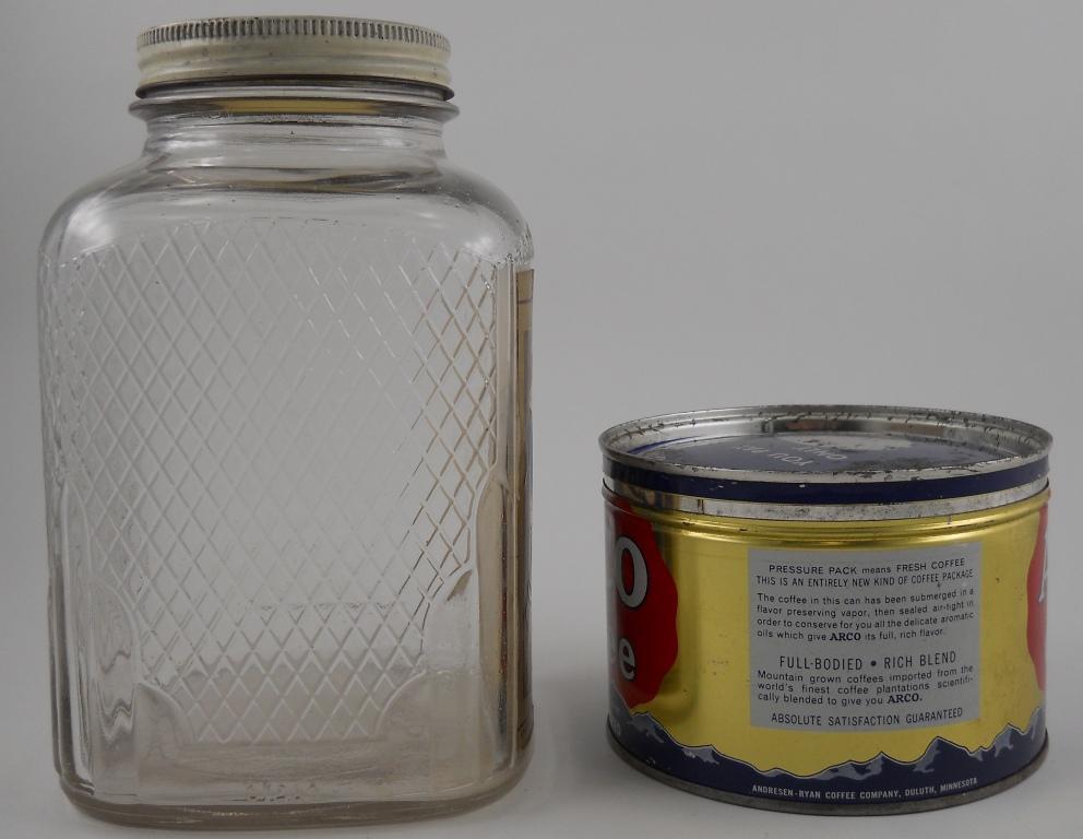 These are both from Andresen Ryan Coffee Company of Duluth, Minnesota for Arco Coffee. The one-pound key-wind can has the correct lid. The jar is about 8-1/8 inches tall x 5-¼ inches x - ¼ inches in diameter.