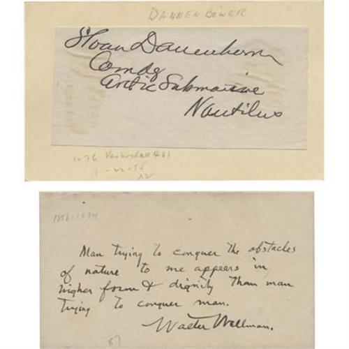 <B>Two Arctic Explorer Signatures,</B></I> including, Walter Wellman an American journalist, explorer, and aronaut, signed card with note, <I>Man trying to conquer the obstacles of nature to me appears in higher form & dignity than man trying to conquer man.</B></I>, 4.5 x 2.5; and, Sloan Danenhower, commander of the <I>Nautilus</B></I> that attempted to cross the Arctic Ocean beneath the ice from Spitzbergen to Alaska by way of the North Pole. Both fine. <BR><BR><b>Shipping:</b> Flat Material, Small (<a target="_blank" href="http://www.heritageauctions.com/common/shipping.php">view shipping information</a>)