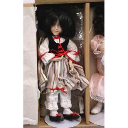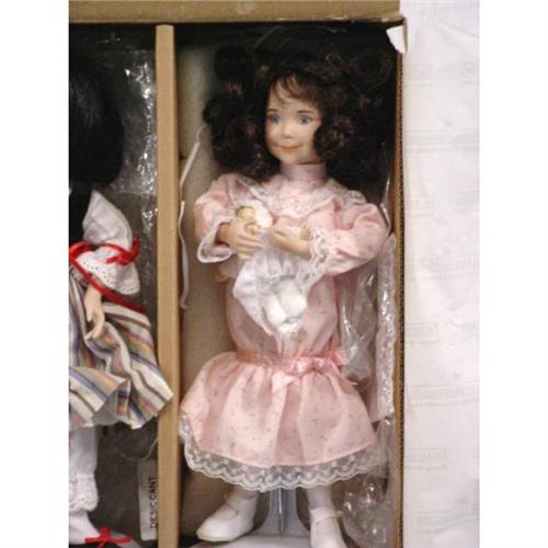 Two 8 inch dolls with porcelain heads, hands, and feet with cloth body. From the Ashton-Drake Galleries, "Cinderella Riches and Sugar and Spice". Original box and packaging in mint condition. Box measures 10" x 9" x 4" and weighs 1 lb 10 oz. [81]