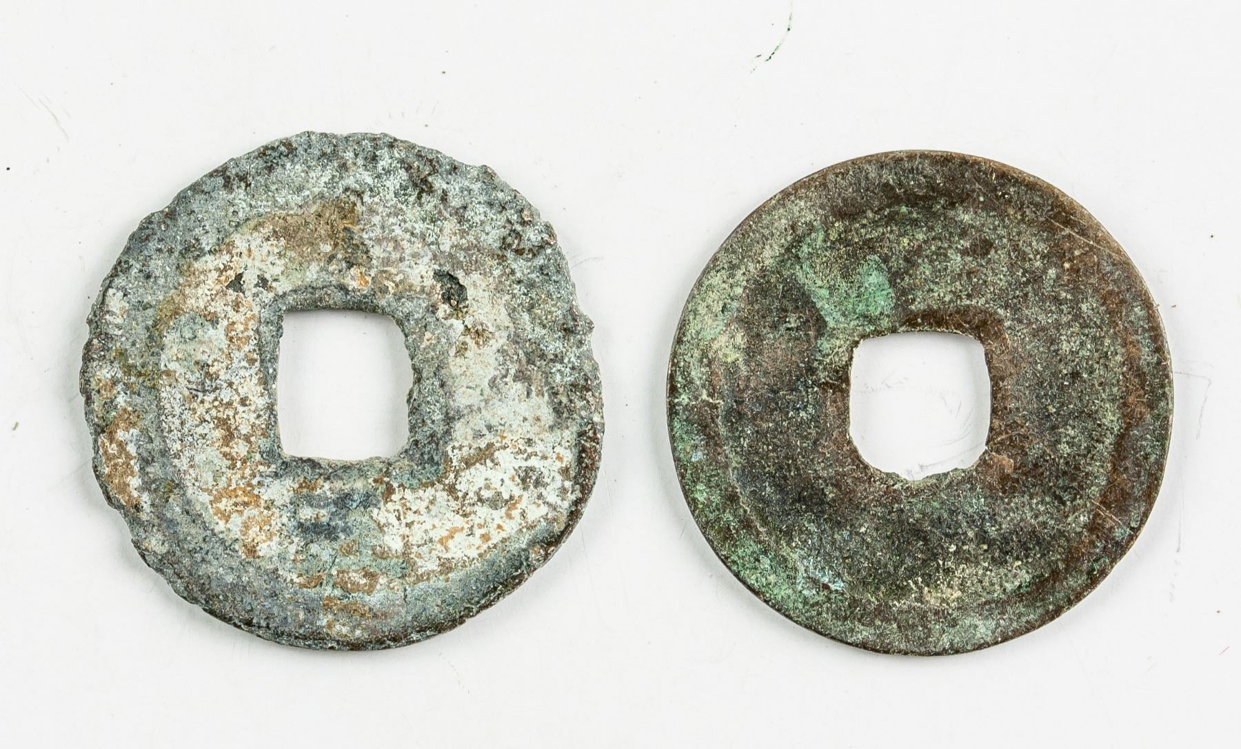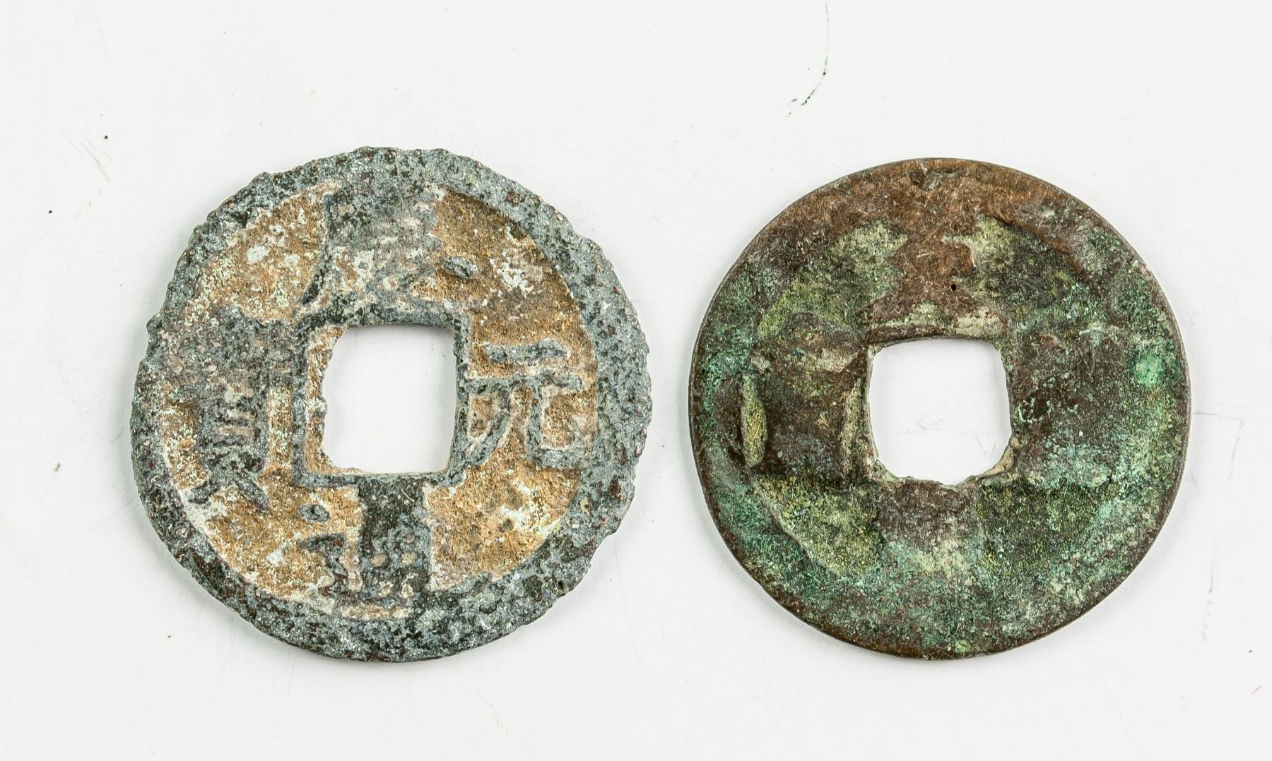 Two (2) assorted Chinese bronze coins, one 1197 Southern Song Qingyuan Tongbao, one unrecognized, D: 22.97-24.08 mm, 4.8 grams total