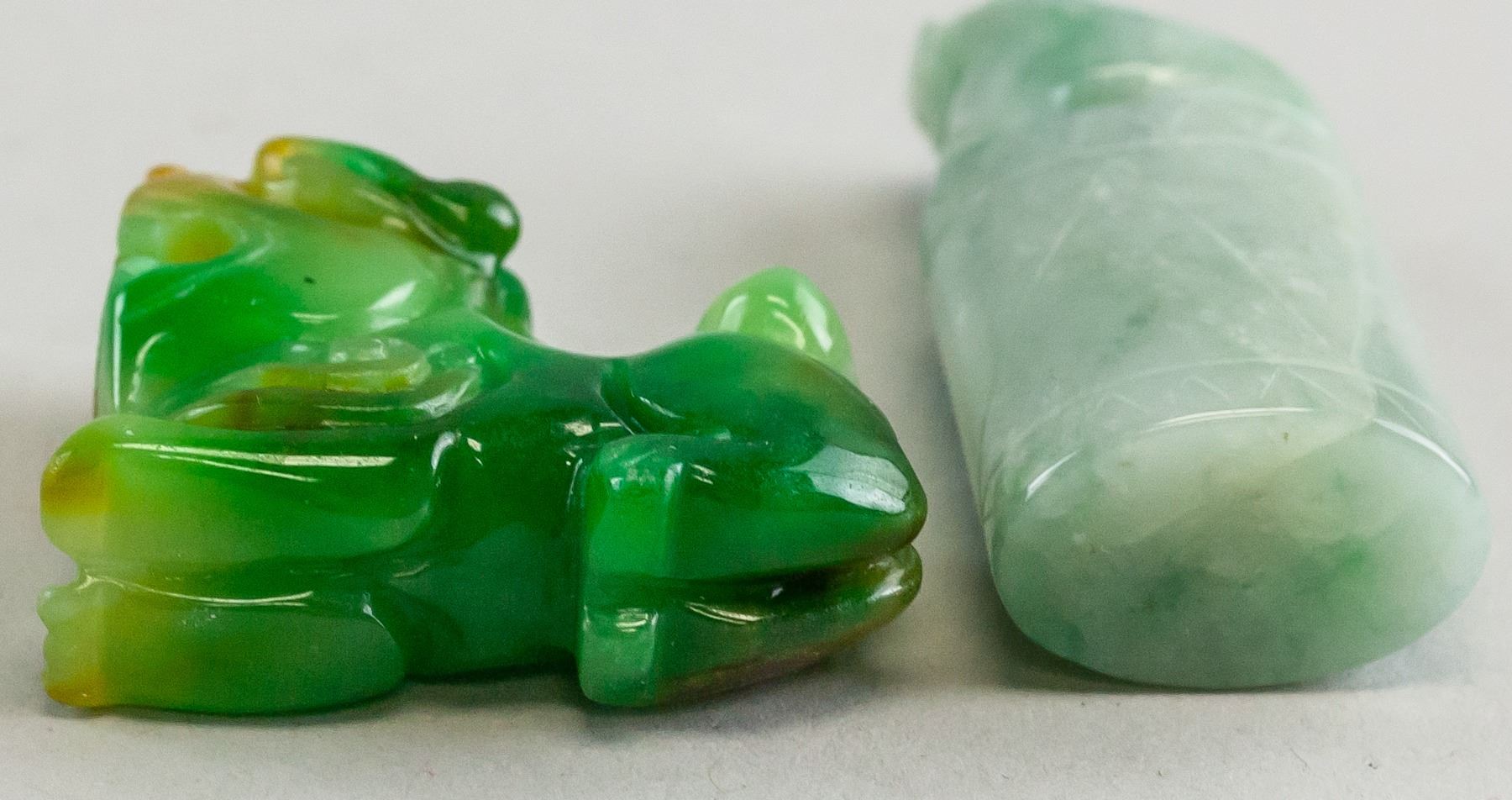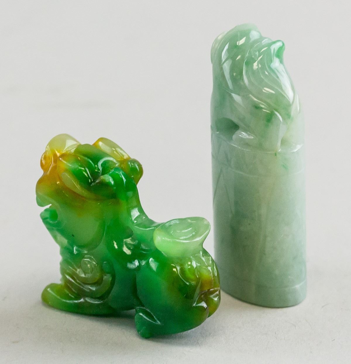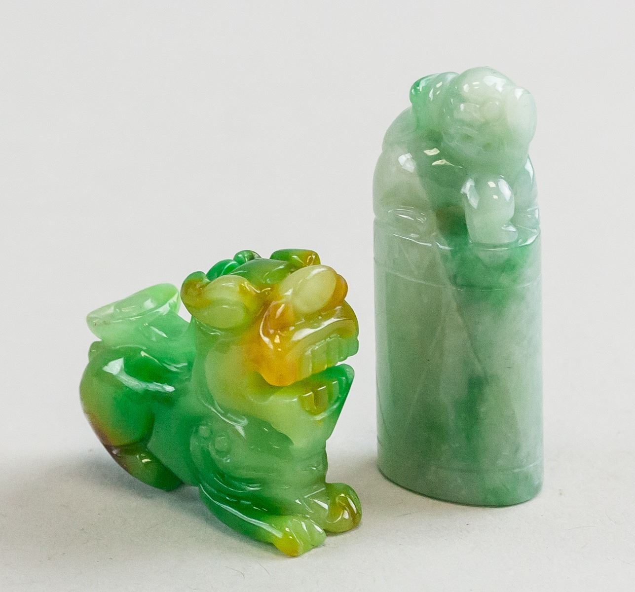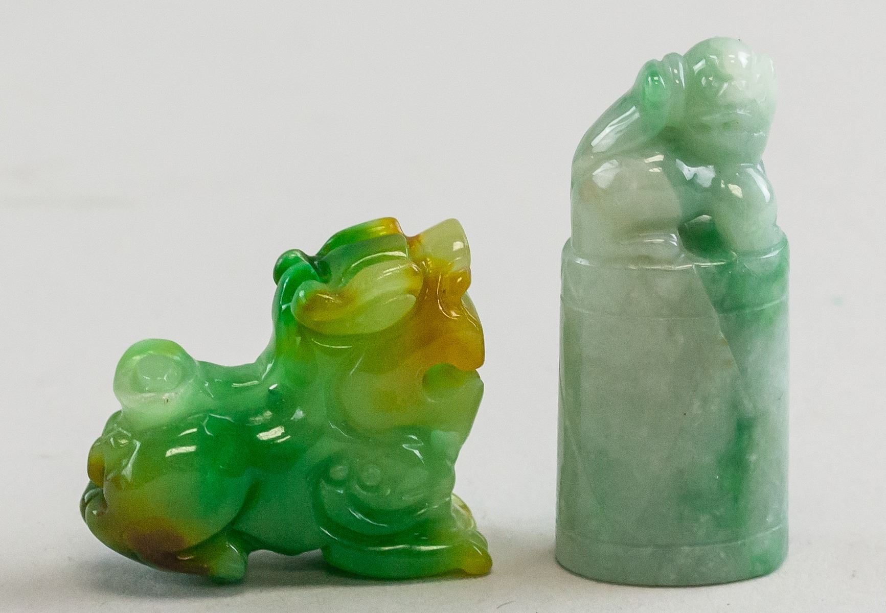Two (2) assorted Chinese green jade carved items. One oval shape seal. One Pixiu miniature. 4.5 x 2 cm and 3 x 3.5 cm, density: 3.24, 40.37 grams total