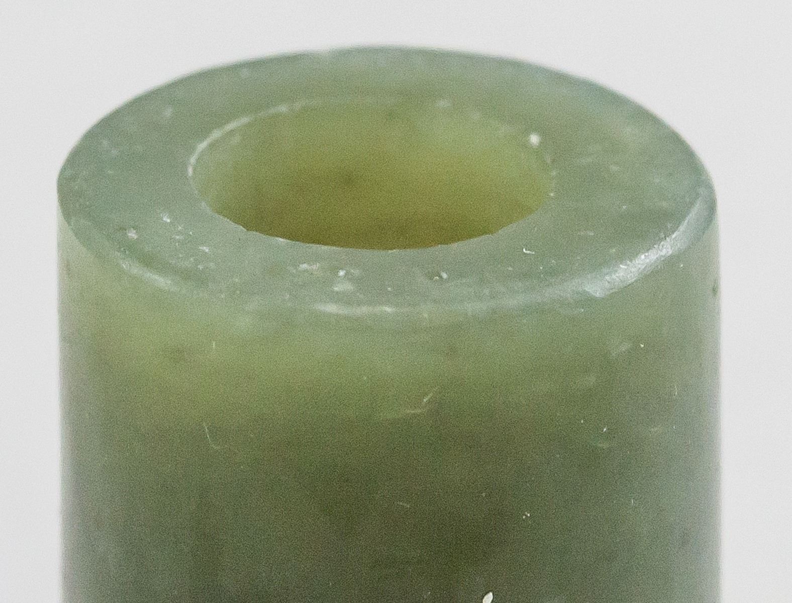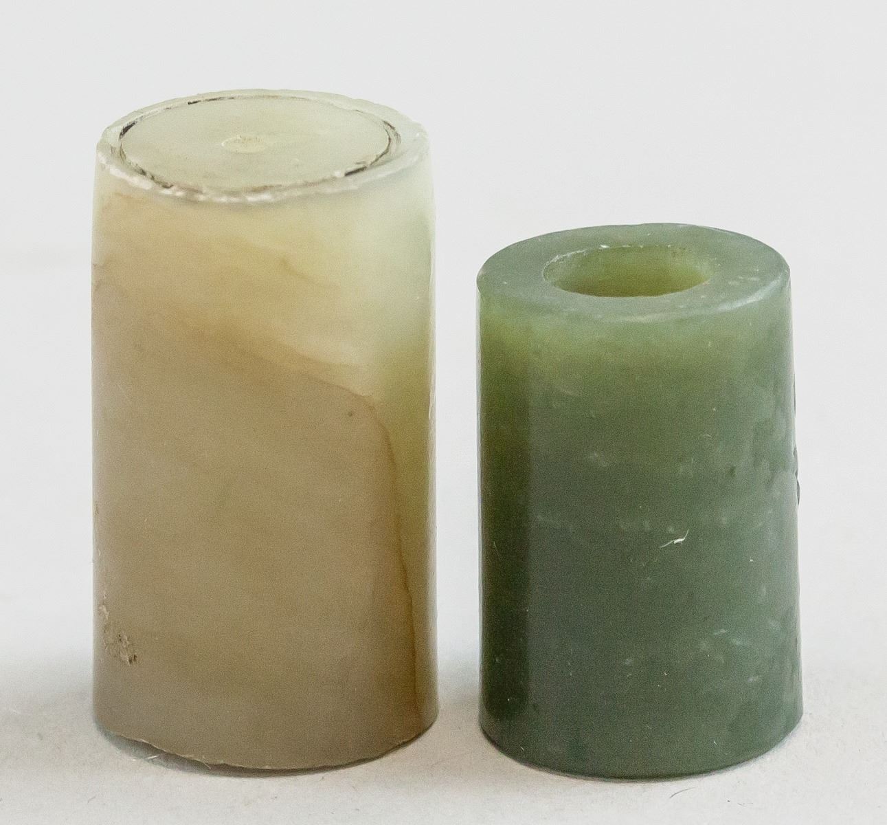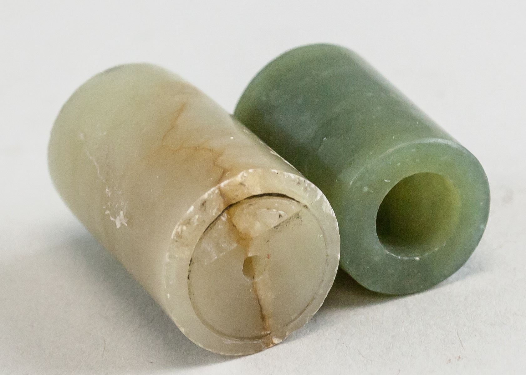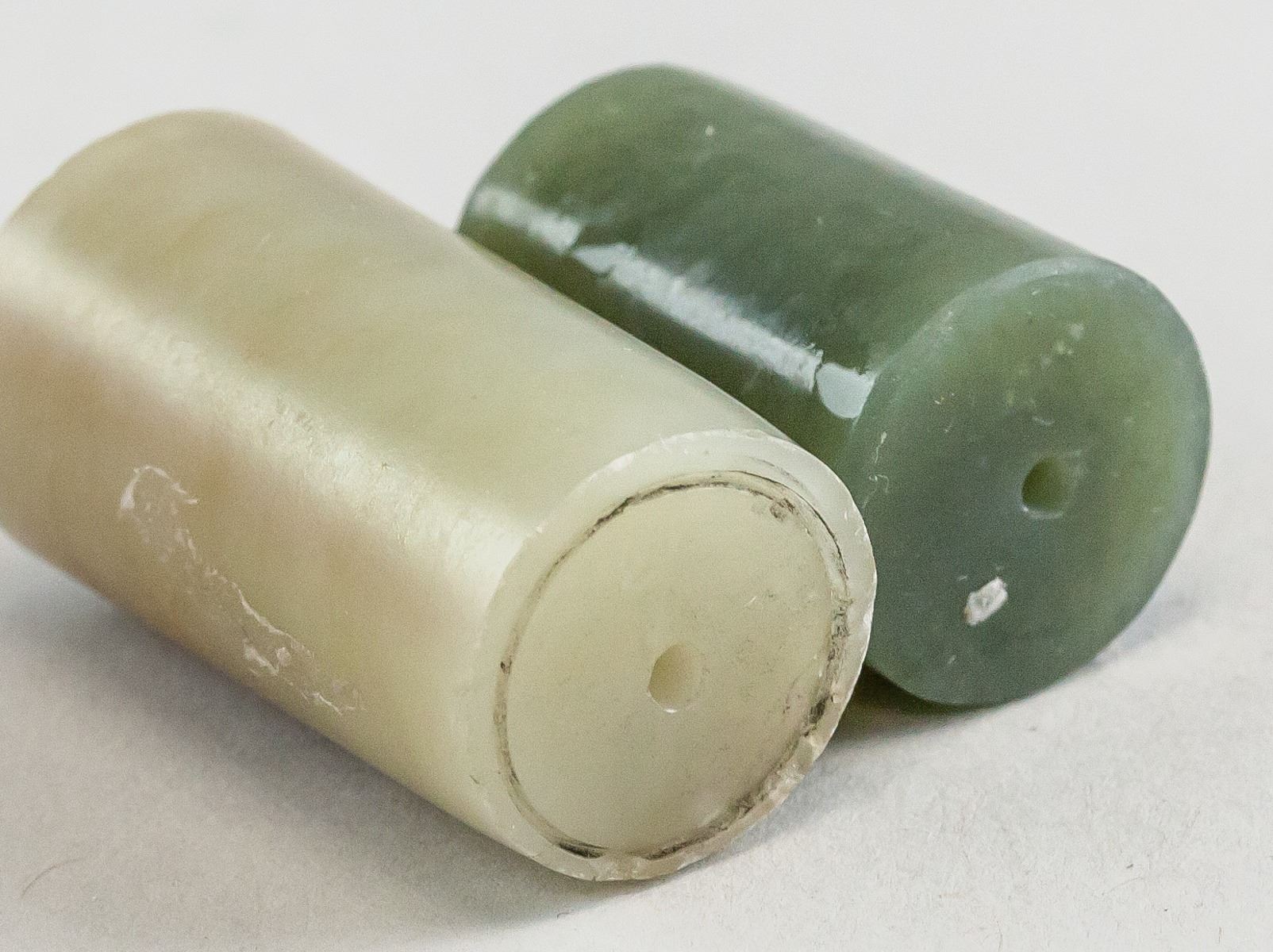 Two (2) assorted Chinese white and green jade carved beads. Of tube form. 3.5 x 2 cm and 2.5 x 1.7 cm, density: 2.93, 44.61 grams total