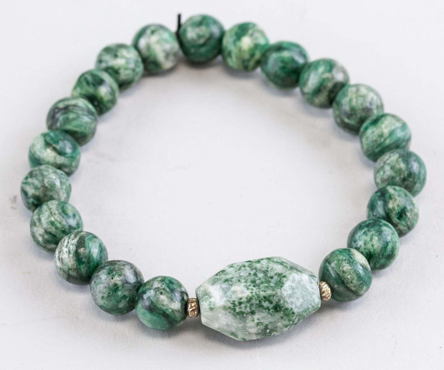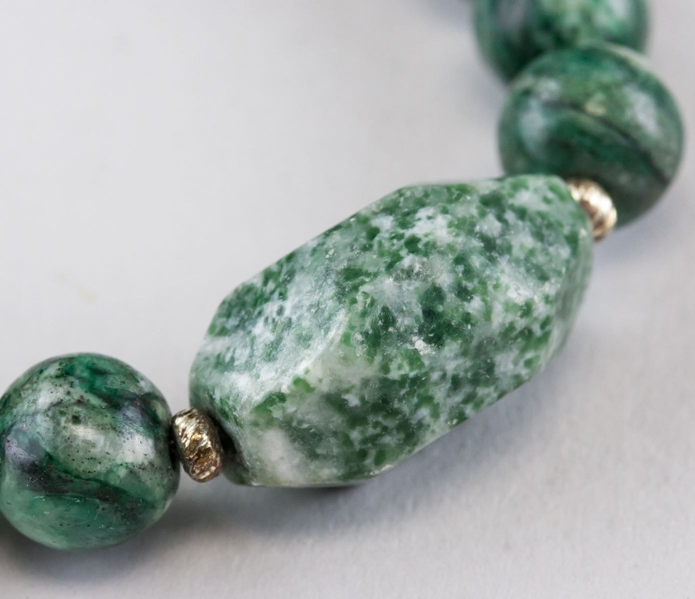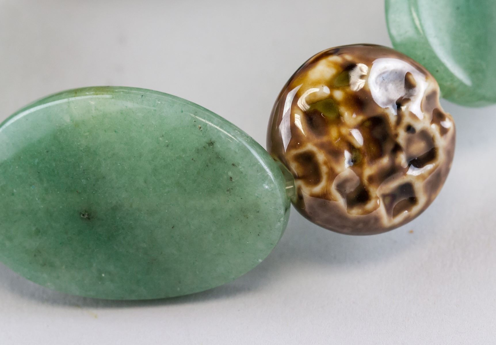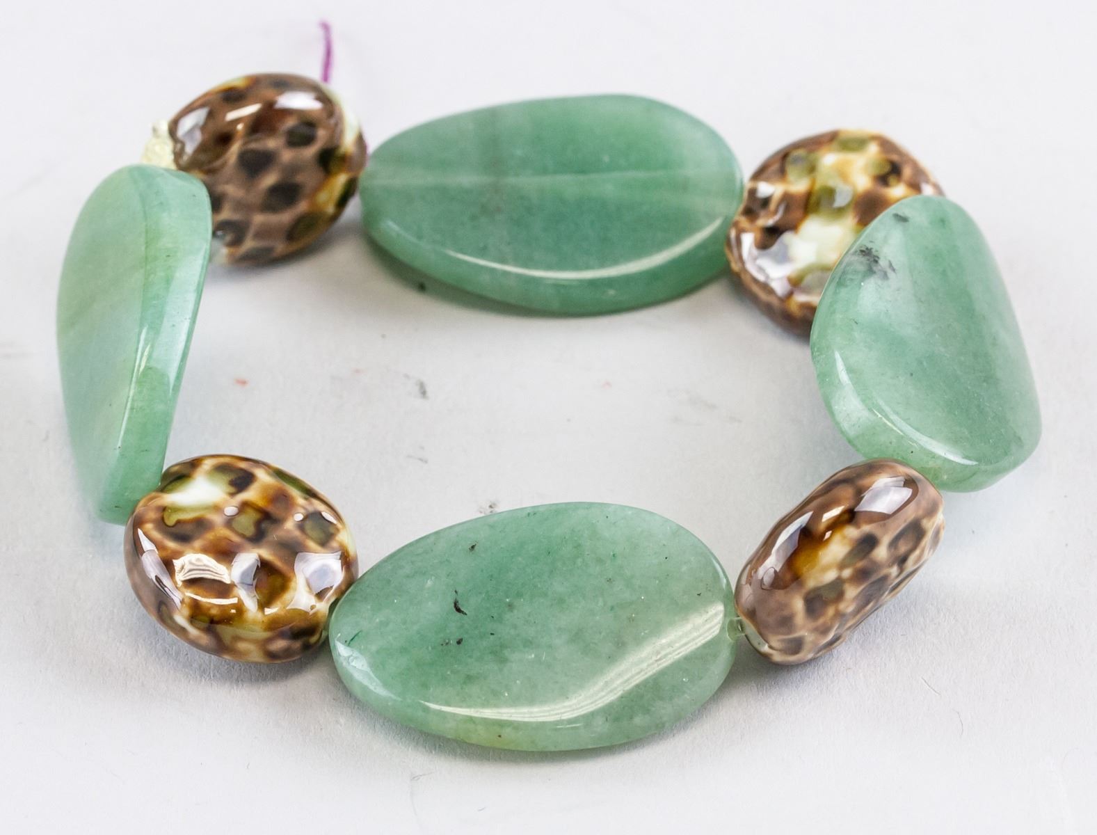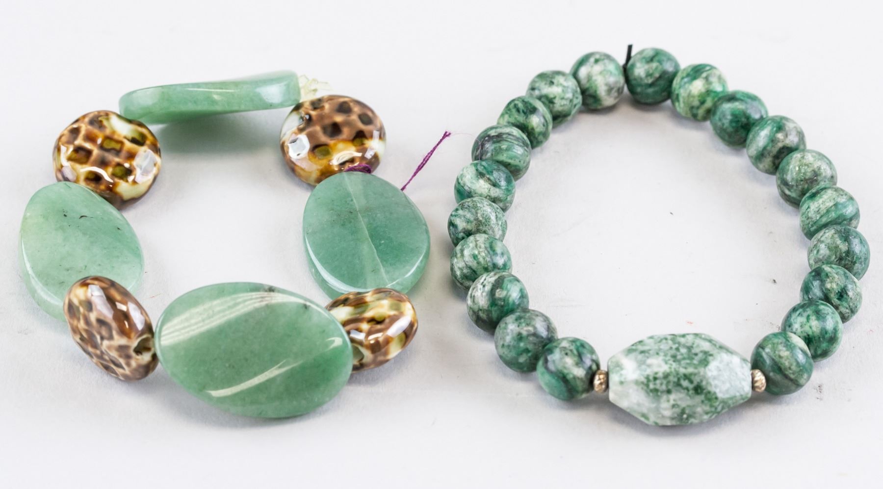 Two (2) assorted Chinese hardstone bracelets. One of oval shape disk beads and brown round beads. One of green round beads. Diameter: 5 cm, 70 grams (each)
