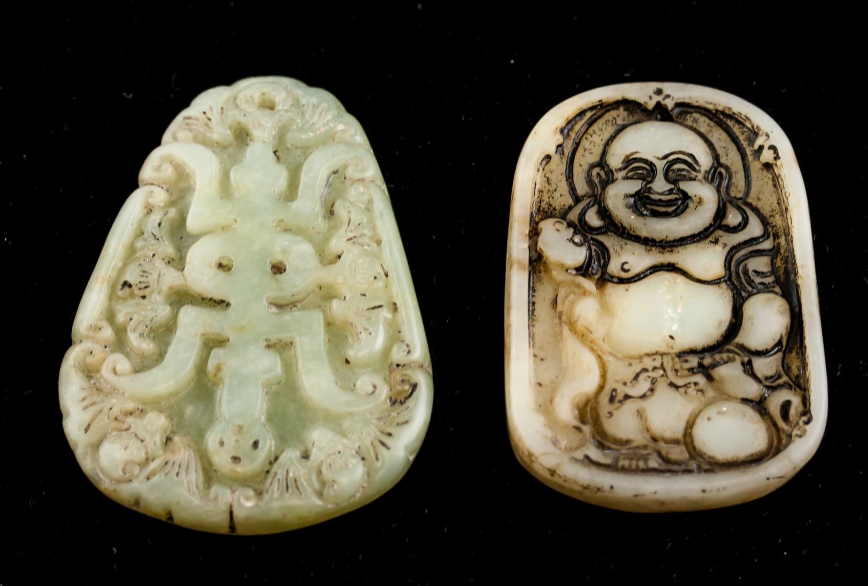 Two (2) assorted Chinese hardstone carved pendant. One carved with bat. One carved with Happy Buddha. Pierced for suspension. 5.5 x 4 cm, 38 grams total