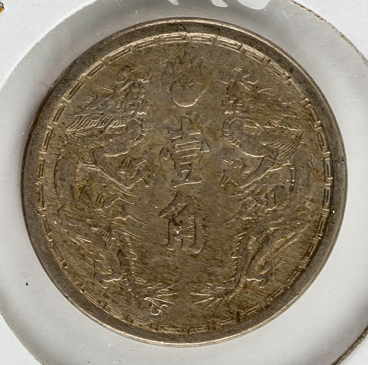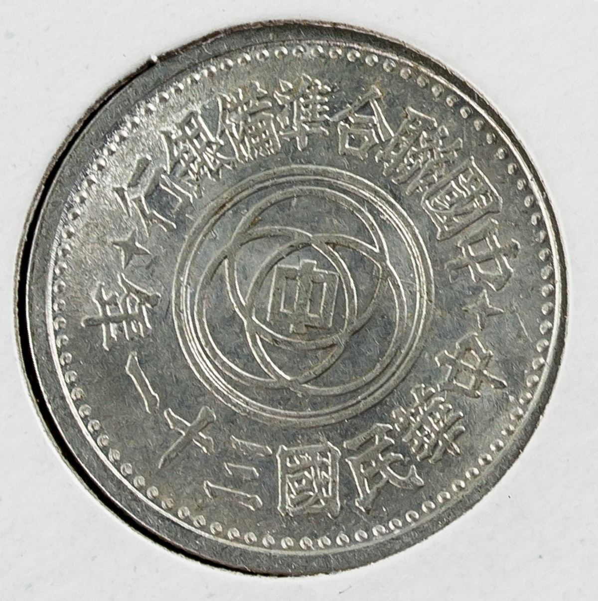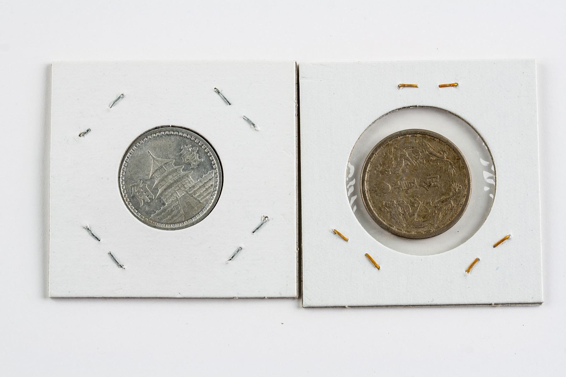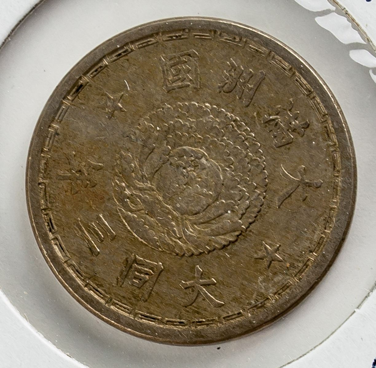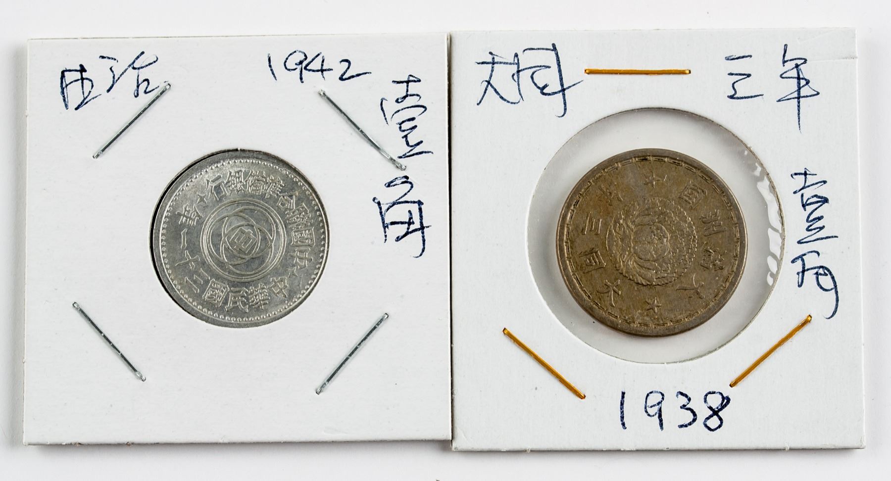 Two (2) assorted Chinese coins, one 1942 Chinese 10 Cents aluminum coin, China Joint Preparatory Bank, Y-525, D: 21.71 mm, one 1938 Chinese Manchukuo 10 Cents copper-nickle coin, Datong 3 Year, Y-8, D: 22.99 mm